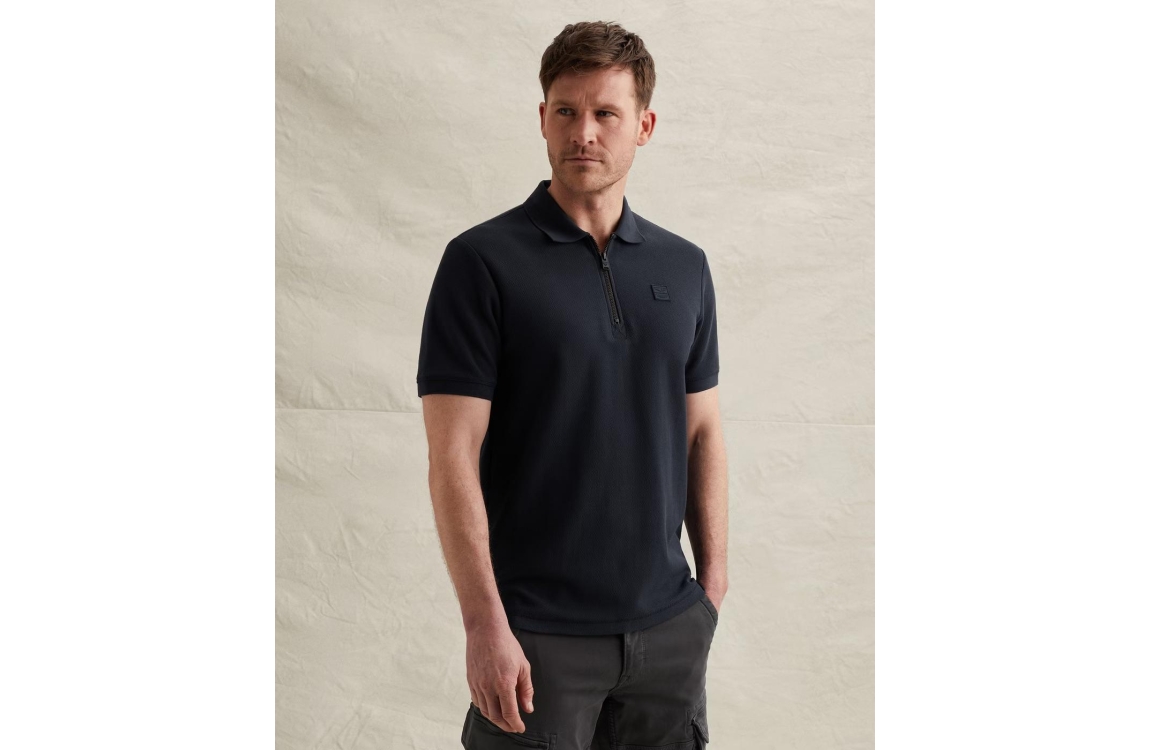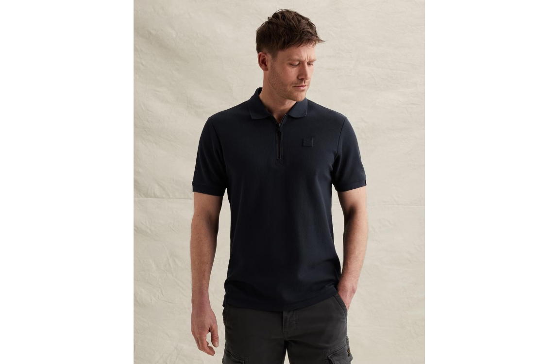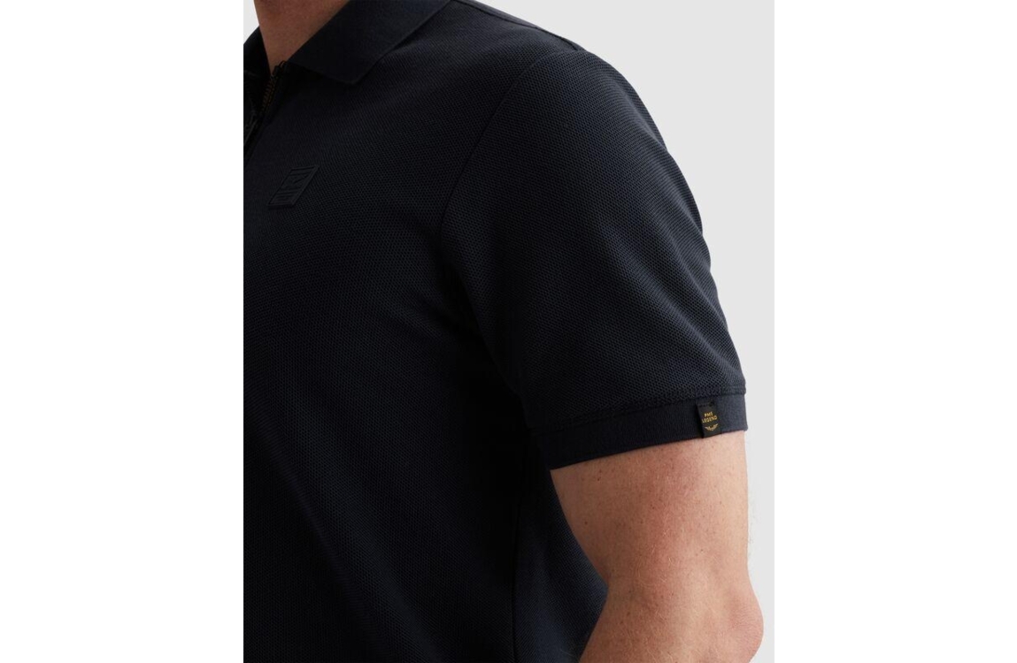 PME Legend polo PPSS2602857. Dit regular fit model heeft een kraag met rits en korte mouwen. Deze donkerblauwe PME Legend polo is uitgevoerd in een 'waffle'-materiaal en beschikt over een logo op de borst.