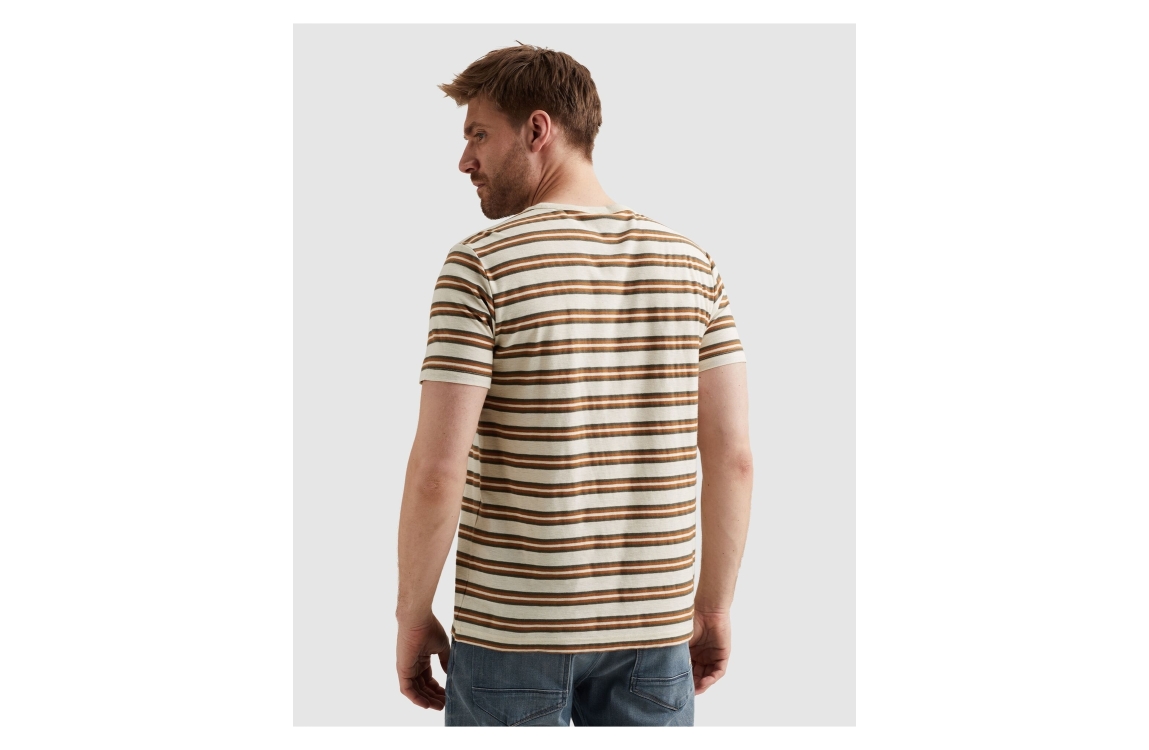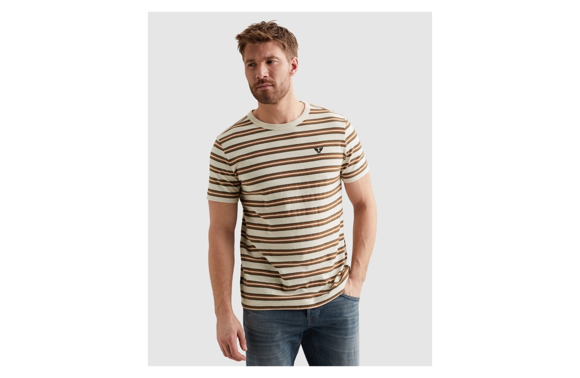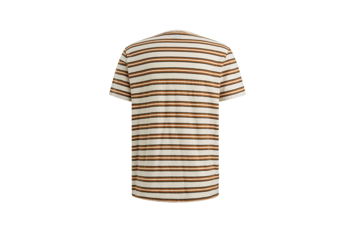 PME Legend T-shirt short sleeve r-neck PTSS2602556. Dit rechtvallend model is voorzien van een ronde hals en heeft korte mouwen. Deze beige T-shirt is bewerkt met strepen en is afgewerkt met het logo op de borst.