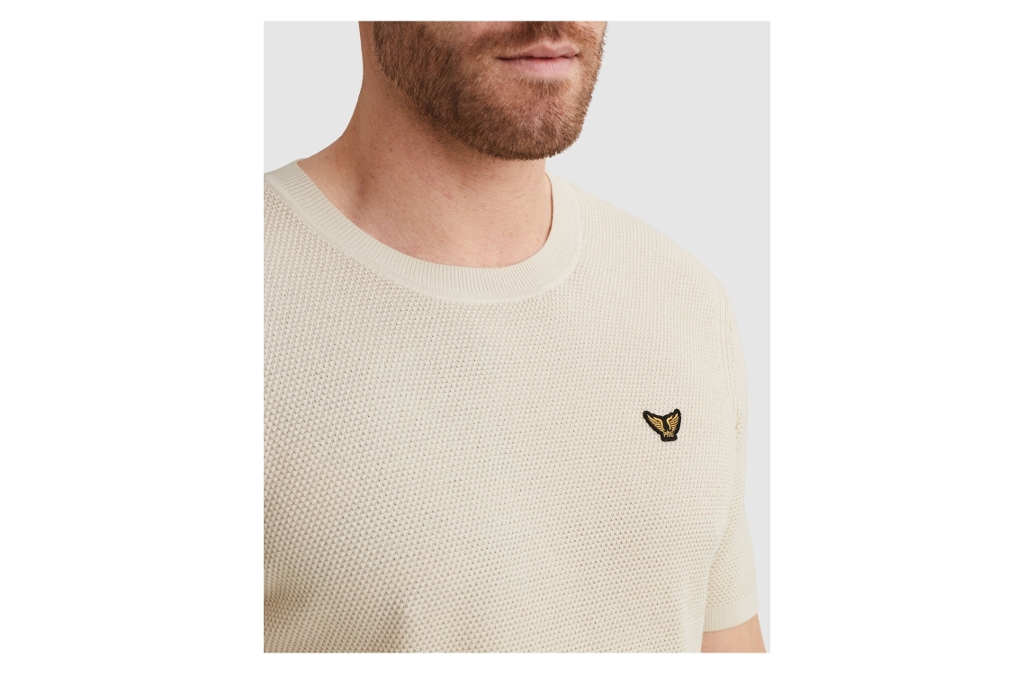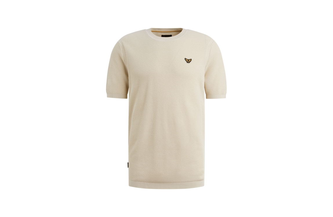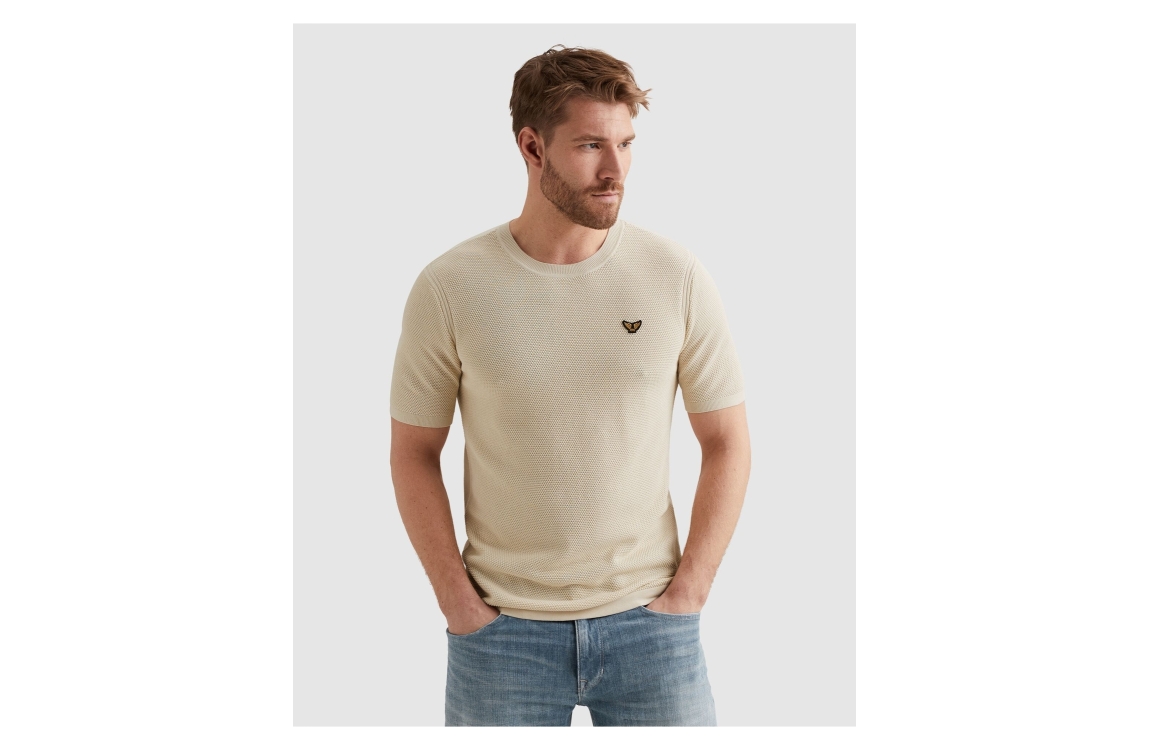 PME Legend T-shirt collar cotton PTSS2602566. Dit rechtvallend model is voorzien van een ronde hals en heeft korte mouwen. Deze beige T-shirt van PME Legend is aan de voorzijde bewerkt met een gehaakt structuur en is afgewerkt met het logo op de borst.