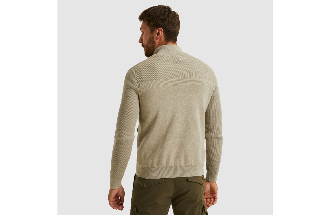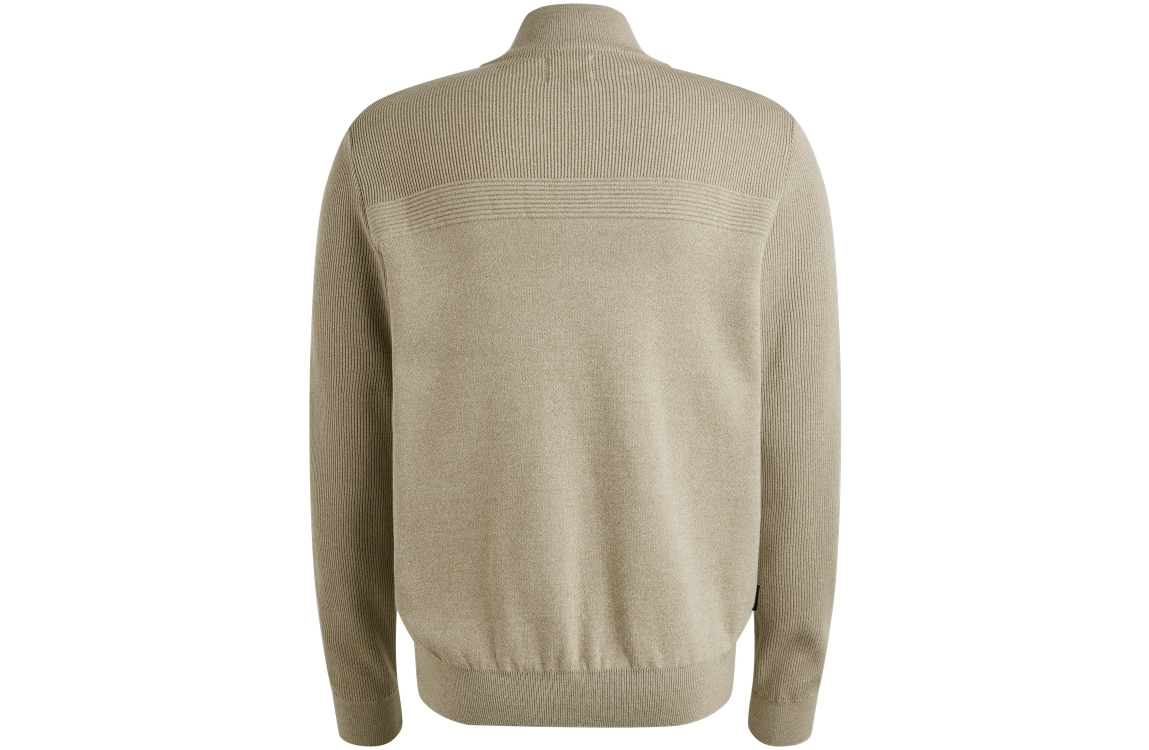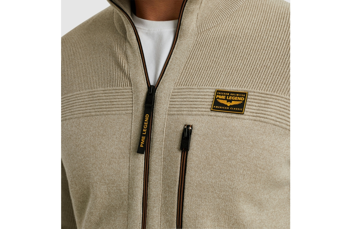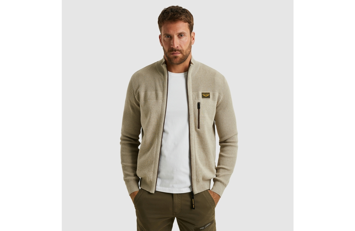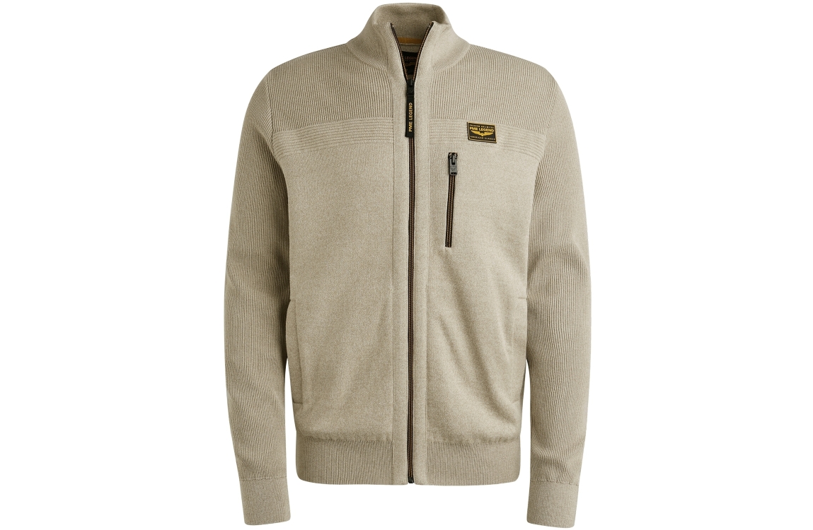 PME Legend vest PKC2509368. Dit regular fit model heeft lange mouwen en een opstaande kraag en is doormiddel van een rits te sluiten. Dit beige/grijze vest van PME Legend is afgewerkt met een rib patroon een logo op de borst en een ritszakje.