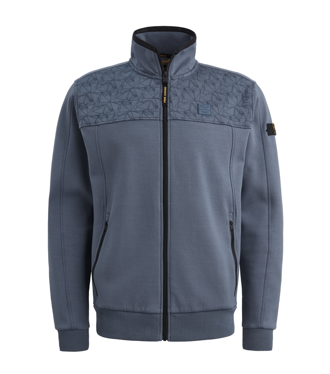 PME Legend vest PSW2511475. Dit rechtvallend model is voorzien van een opstaande kraag en heeft lange mouwen. Deze blauwe PME Legend vest sluit door middel van een rits en heeft twee ritszakken. Dit model is aan de bovenzijde gestructureerd bewerkt en is afgewerkt met het logo op de borst.