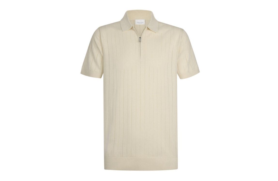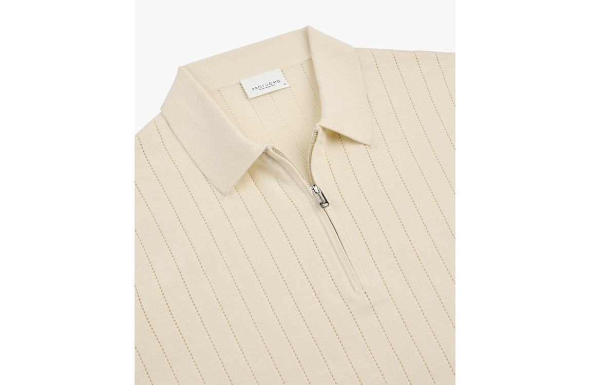 Profuomo polo half zip PPXD10029D. Dit rechtvallend model is voorzien van een kraag en heeft korte mouwen. Deze crèmekleurige polo sluit door middel van een rits aan de bovenzijde ne is all-over bewerkt met een structuur.