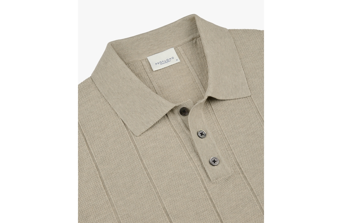 Profuomo polo PPXD10030E. Dit rechtvallend model is voorzien van een kraag en heeft korte mouwen. Deze beige polo van Profuomo sluit door middel van knopen en is uitgevoerd in een structuur.