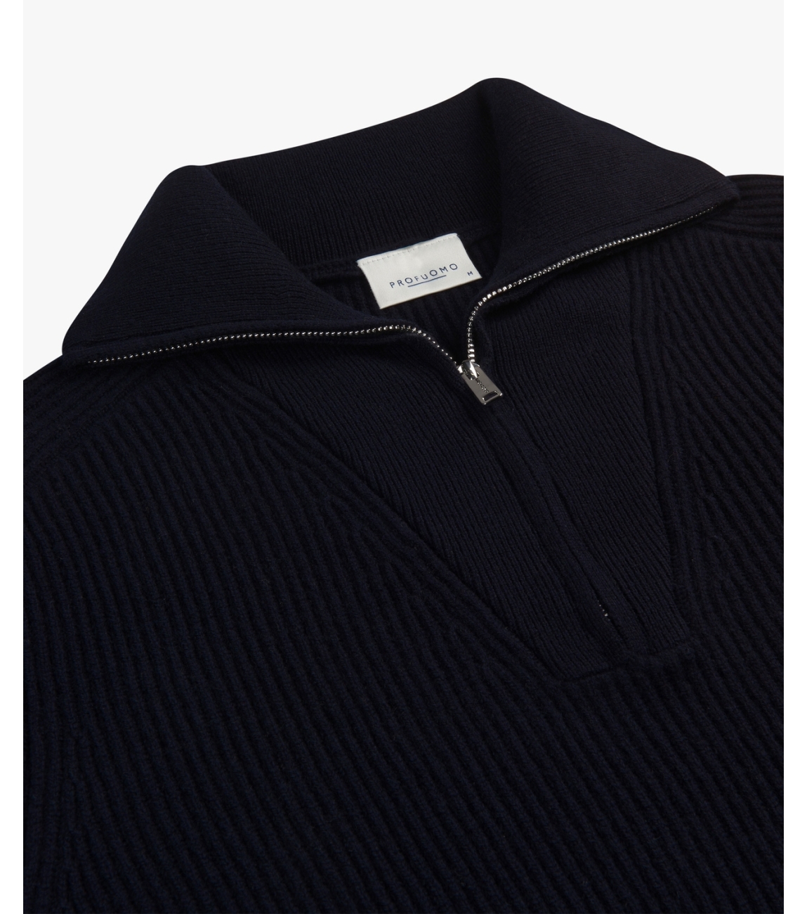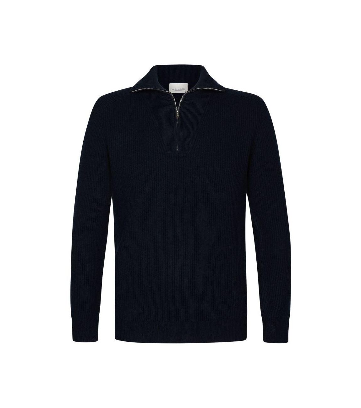 Profuomo PULLOVER HALF ZIP NAVY Pnavy. Dit rechtvallende model heeft lange mouwen en opstaande boord. Deze blauwe trui van Profuomo heeft elastische boorden, een gewoven sturctuur en een half zip.