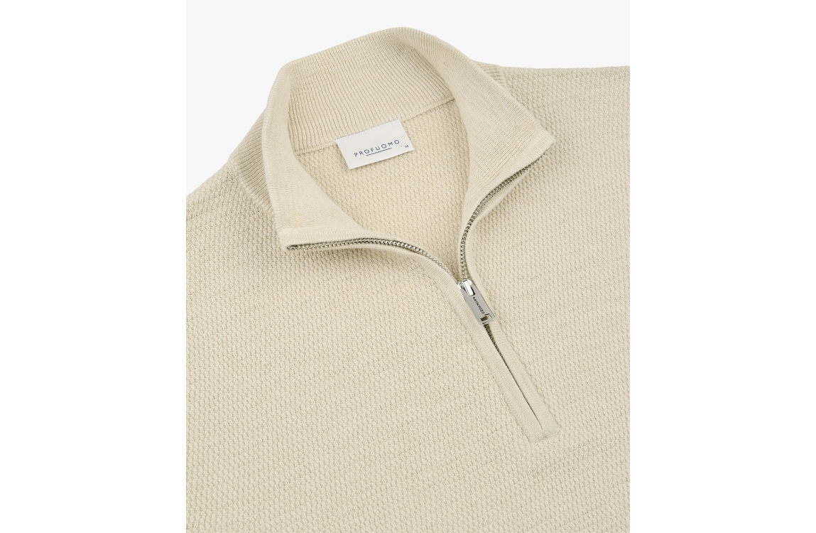 Profuomo pullover halfzip PP2J00010C. Dit rechtvallend model is voorzien van een opstaande kraag en heeft. lange mouwen. Deze beige pullover sluit door middel van een rits en is uitgevoerd in een gehaakte fijne structuur.