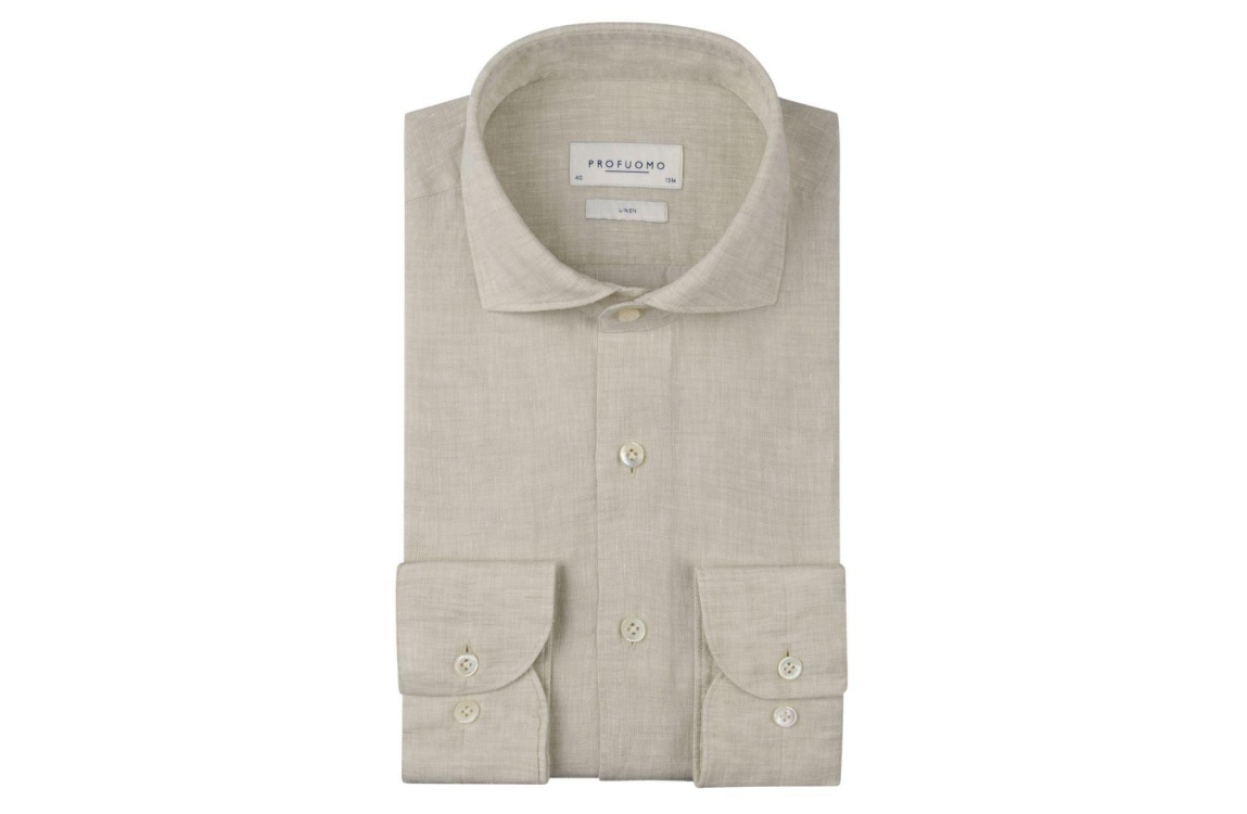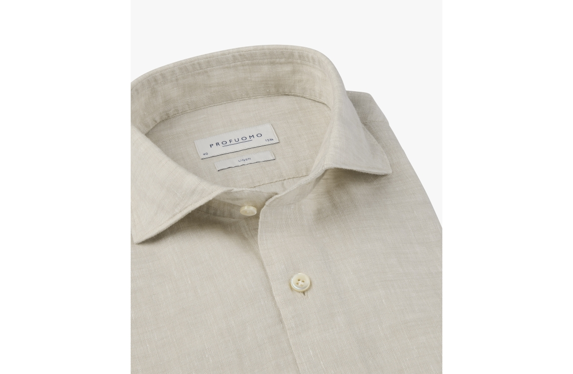 Profuomo overhemd PPXH10017K. Dit regular fit model heeft een kraag en lange mouwen. Deze zandkleurige overhemd van Profuomo sluit aan de voorzijde door middel van knopen en is afgewerkt met manchetten.