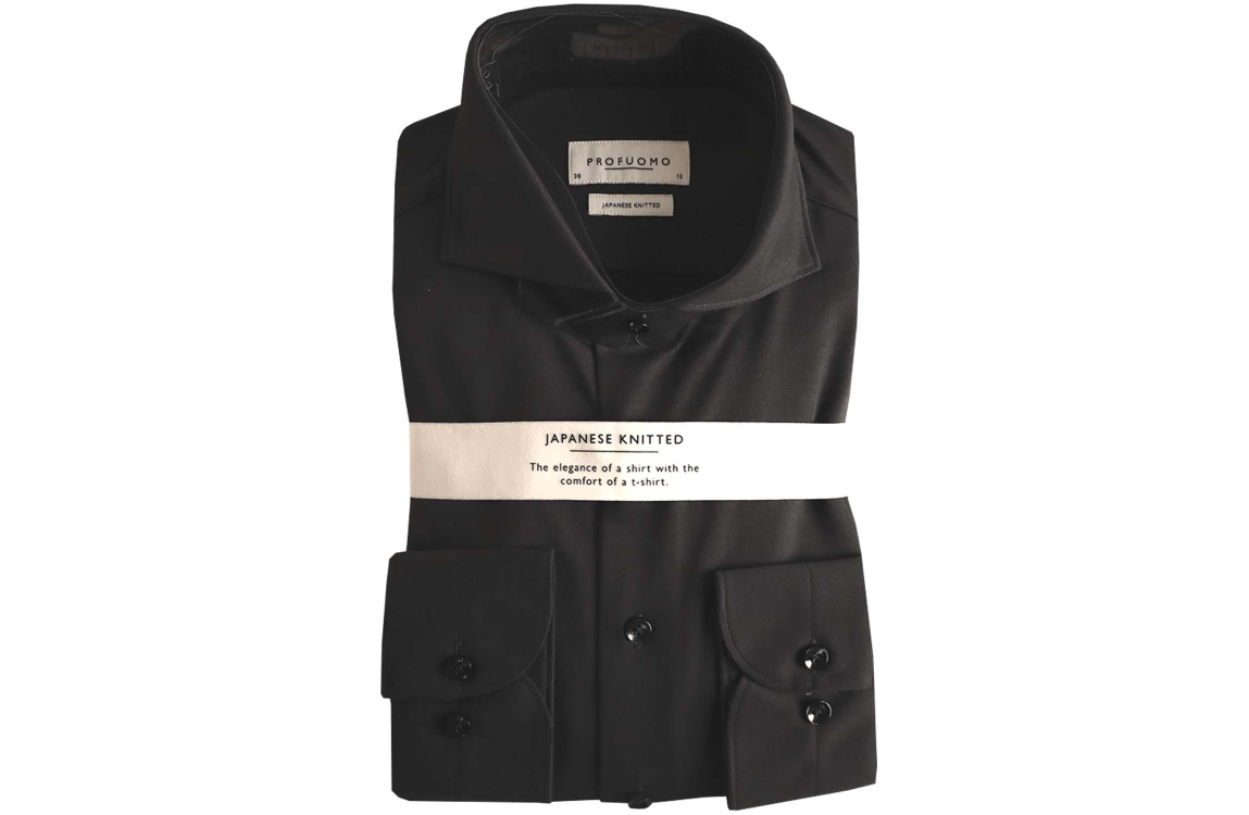 Profuomo overhemd PPVH30044B. Dit slim fit model sluit aan de voorzijde met knoopjes, beschikt over een cutaway kraag en heeft lange mouwen afgewerkt met een manchet. Deze donkerblauwe overhemd van Profuomo is uitgevoerd in een 'japanese knit' stretch kwaliteit.