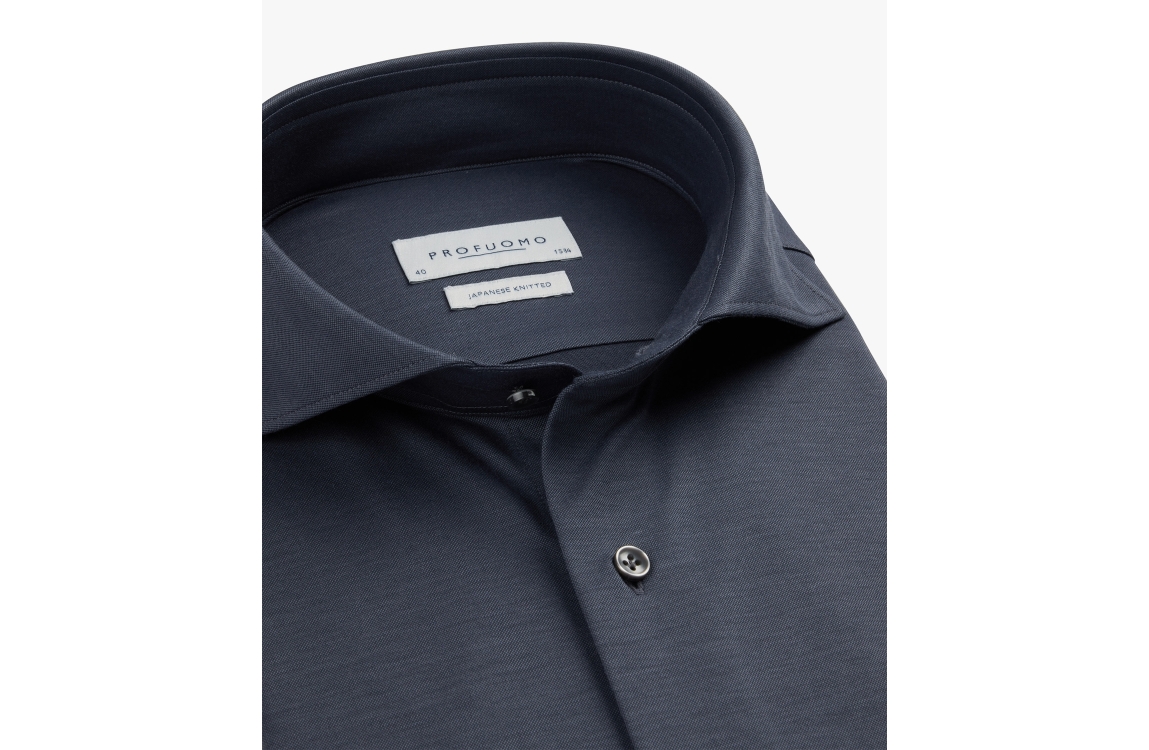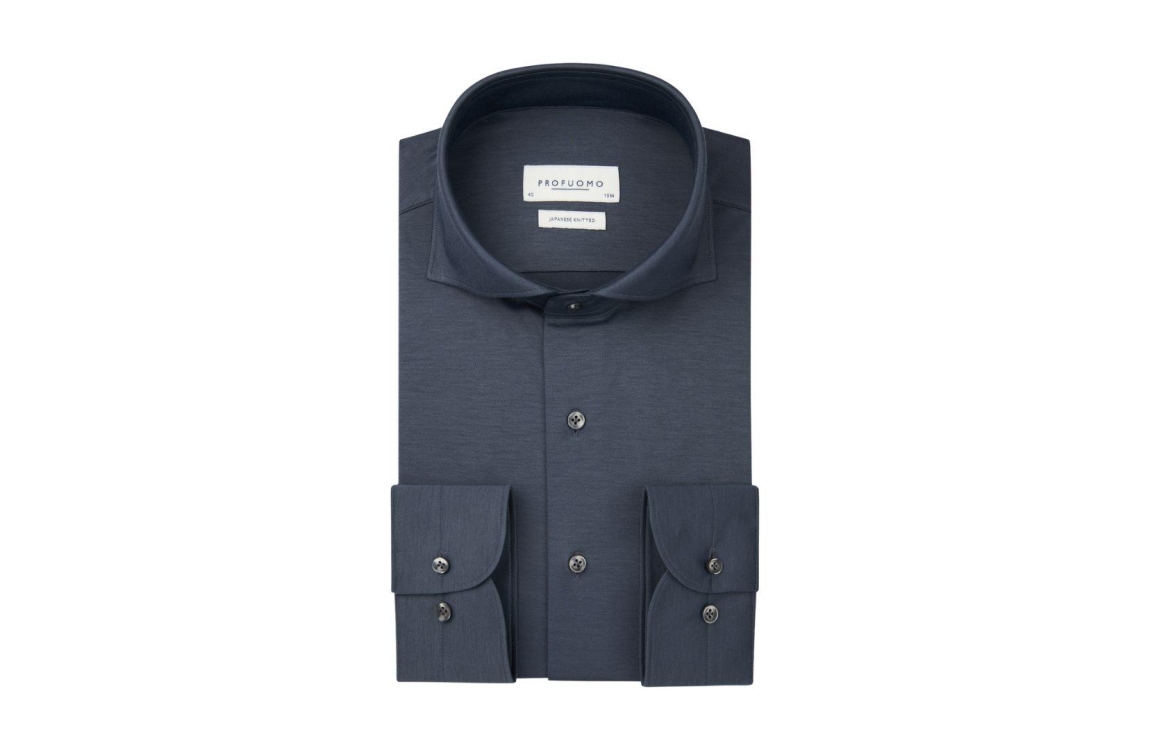 Profuomo overhemd PPWH30026i. Dit slim fit model sluit aan de voorzijde met knoopjes, beschikt over een cutaway kraag en heeft lange mouwen afgewerkt met een manchet. Deze blauwe overhemd van Profuomo is uitgevoerd in een 'japanese knit' stretch kwaliteit.