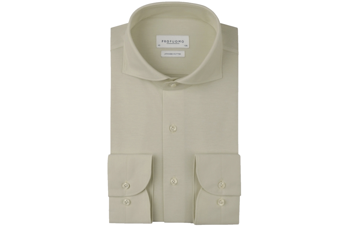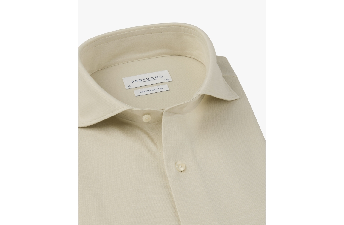 Profuomo overhemd PPXH10031A. Dit slim fit model is voorzien van een cutaway kraag en heeft lange mouwen afgewerkt met een split en knopen. Dit zand kleurige overhemd van Profuomo sluit aan de voorzijde door middel van knopen. Dit model is uitgevoerd in een 'japanese knit' stretch kwaliteit.