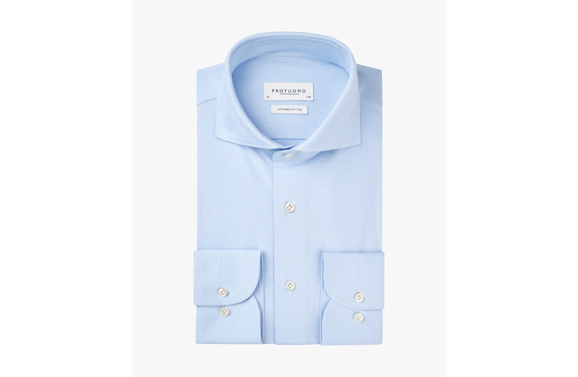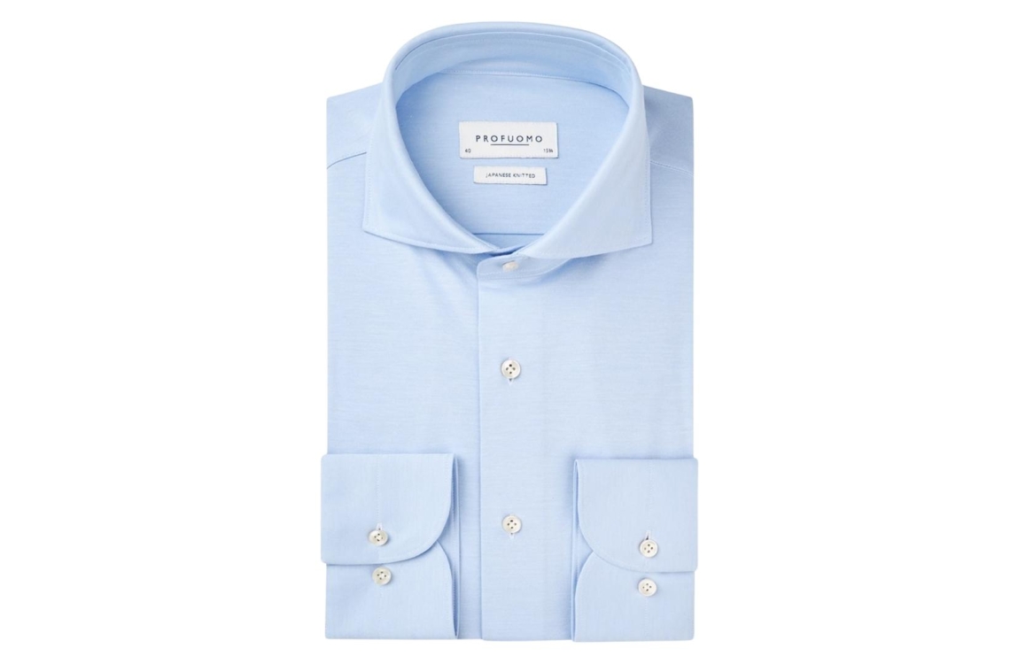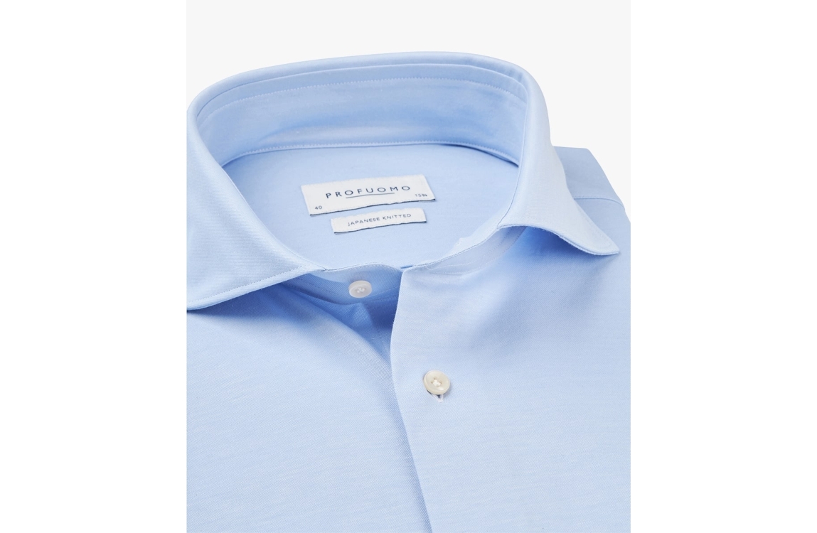 Profuomo overhemd PP2HC10009. Dit slim fit model sluit aan de voorzijde met knoopjes, beschikt over een cutaway kraag en heeft lange mouwen afgewerkt met enkel manchet. Deze licht blauwe overhemd van Profuomo is uitgevoerd in een 'japanese knit' stretch kwaliteit.