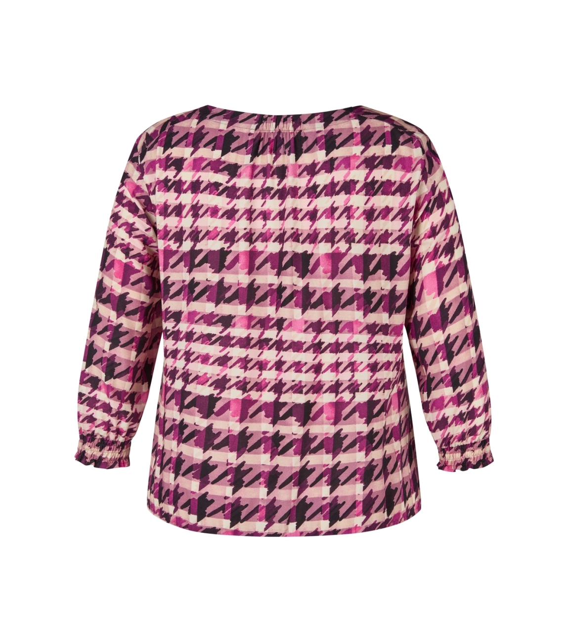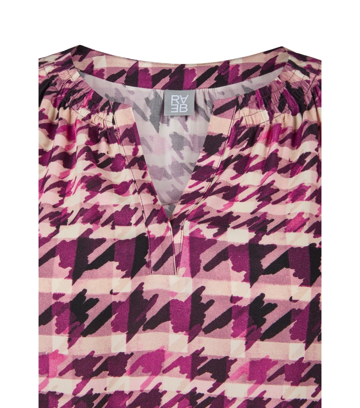 Rabe Bluse 5287 Pflaume. Dit rechtvallende model heeft een v-hals en driekwart mouwen. Deze paarse blouse van Rabe is bewerkt met een grafische print en is aan de onderzijde afgewerkt met elatische boorden.