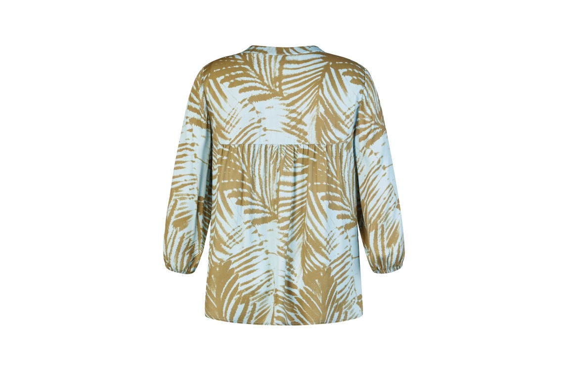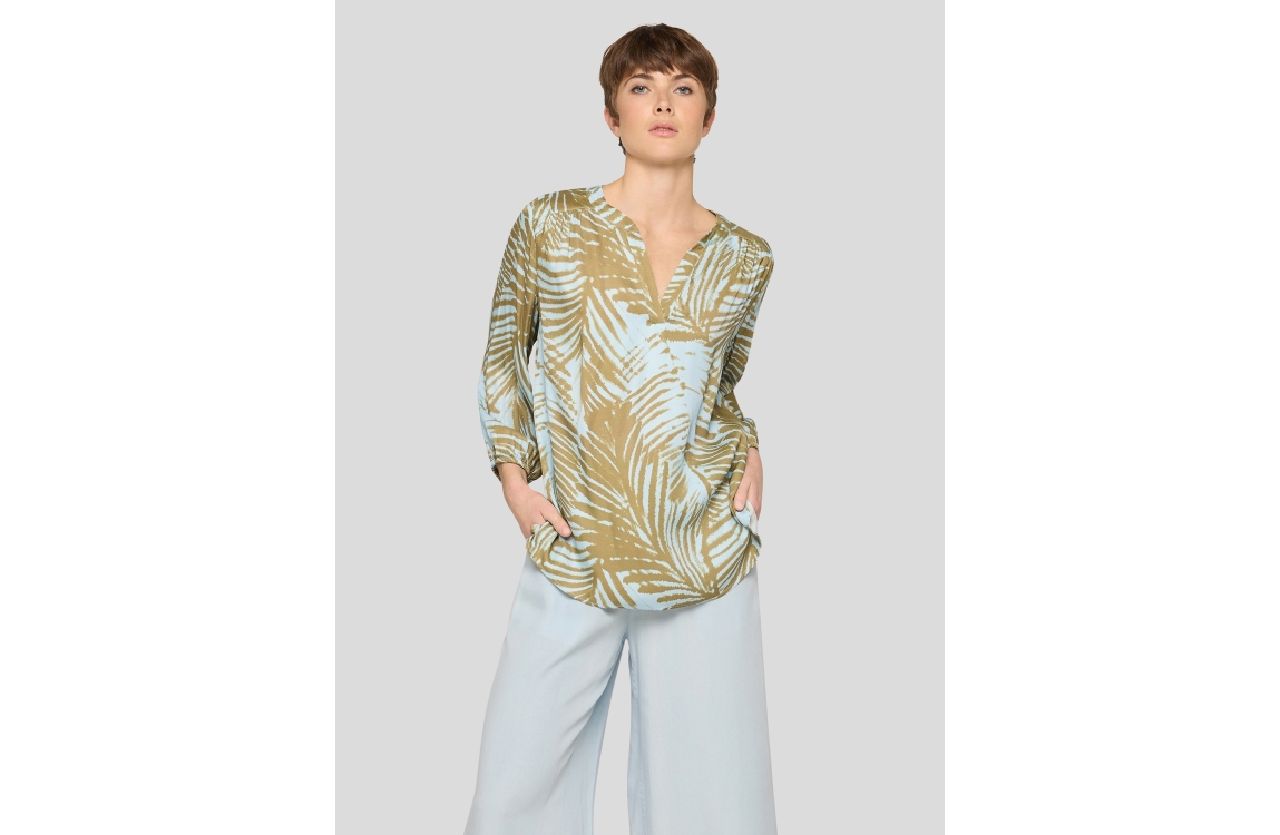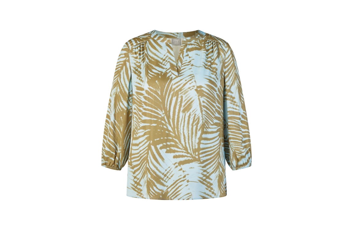 Rabe blouse 56-122106 6309. Dit rechtvallende model heeft een V-hals en korte mouwen, met elastische boorden. Deze lichtblauwe blouse van Rabe is all-over bewerkt met een donkergroene, grafische print.