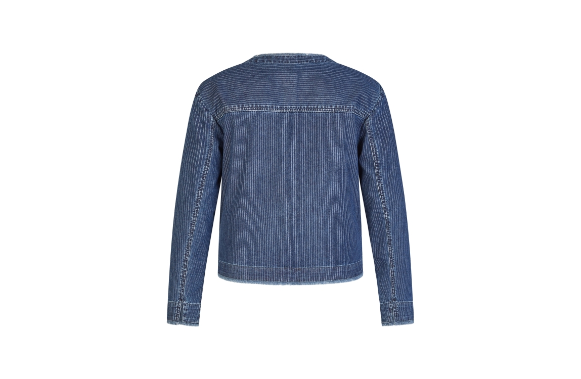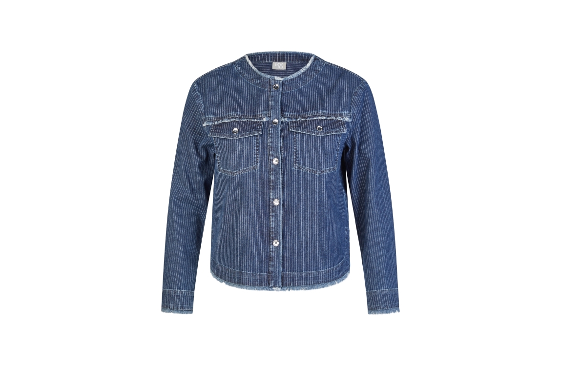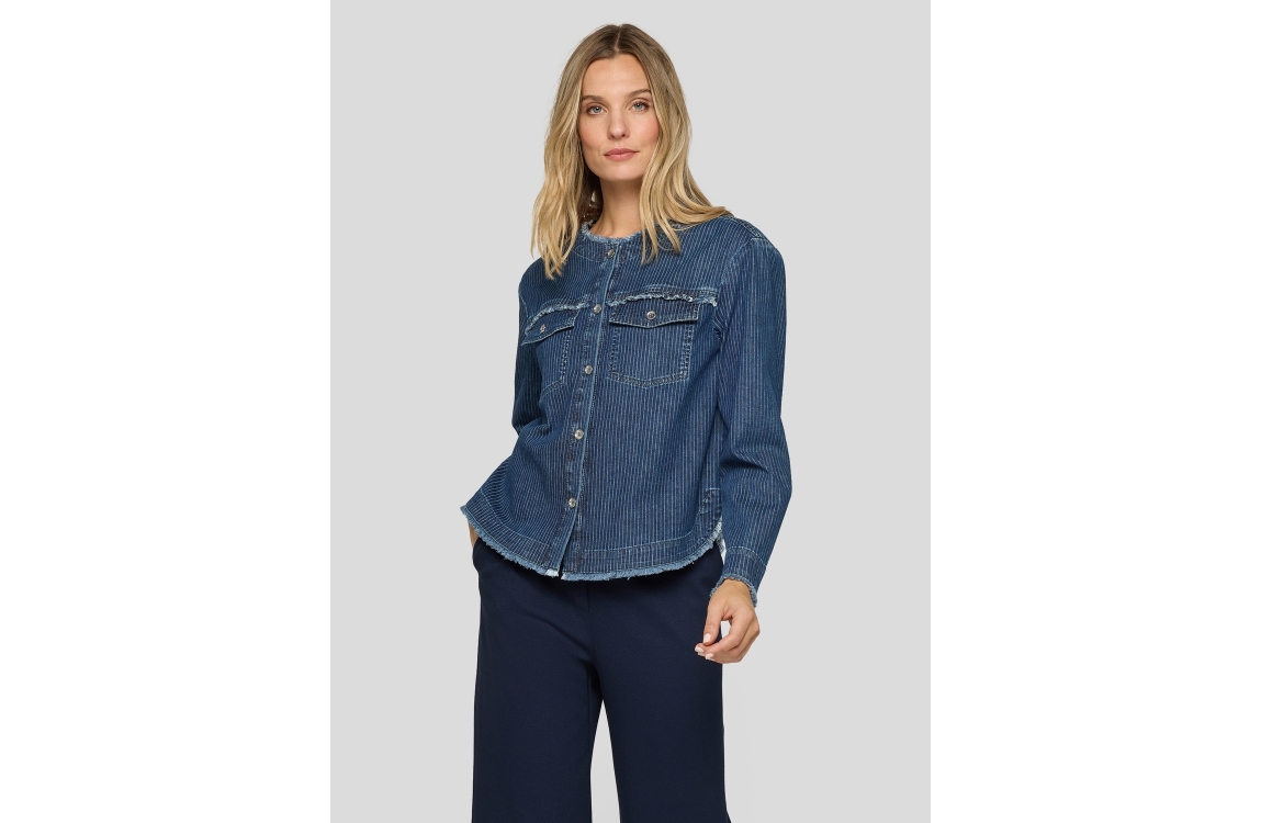 Rabe blouse 56-111103 6360. Dit rechtvallende model heeft een ronde halslijn en lange mouwen. Deze denimblauwe blouse van Rabe sluit aan de voorzijde door middel van knopen en is voorzien van twee borstzakken. Het model is all-over bewerkt met een streepprint en is op de boorden gedetailleerd met ruffles.