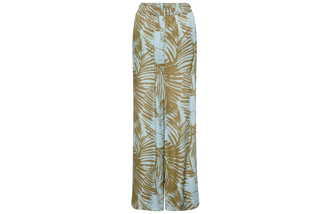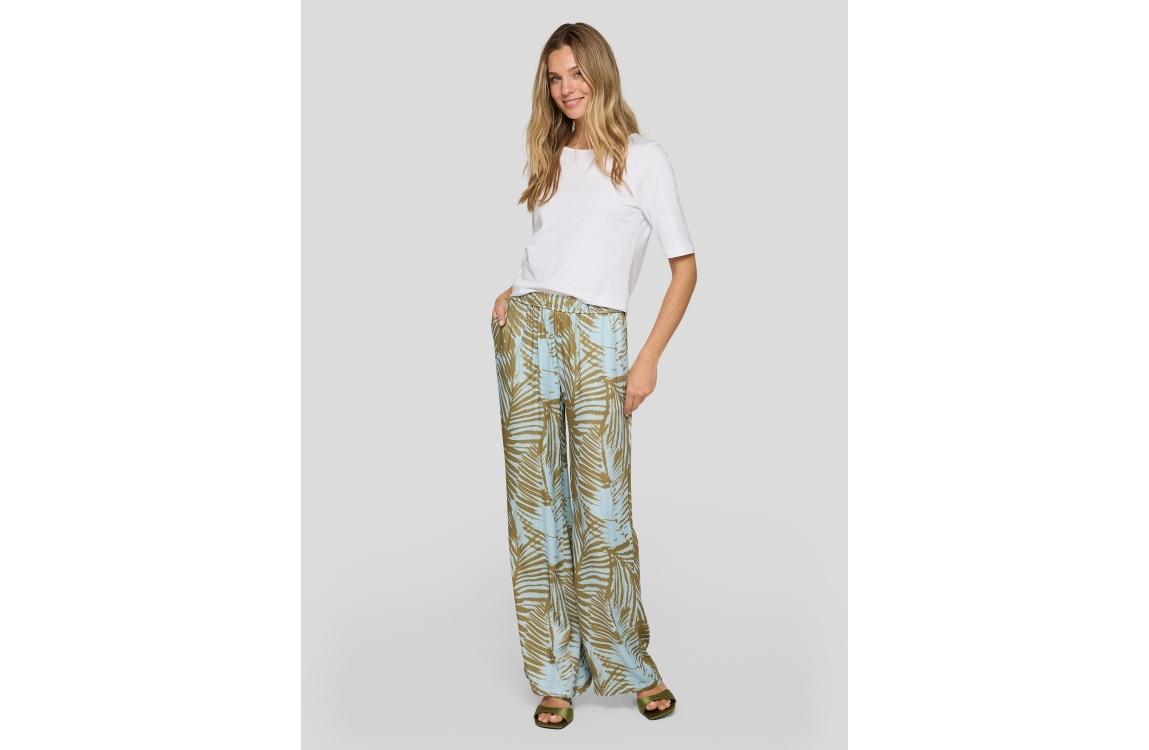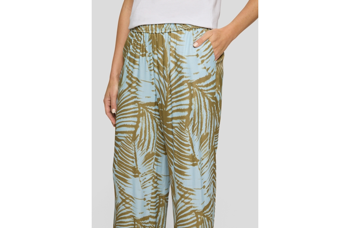 Rabe Hose 6309 Himmelblau. Dit soepelvallende model is voorzien van een elastische tailleband. Deze blauwe broek van Rabe is all-over bewerkt met een print en heeft twee steekzakken.