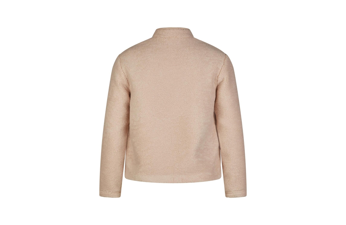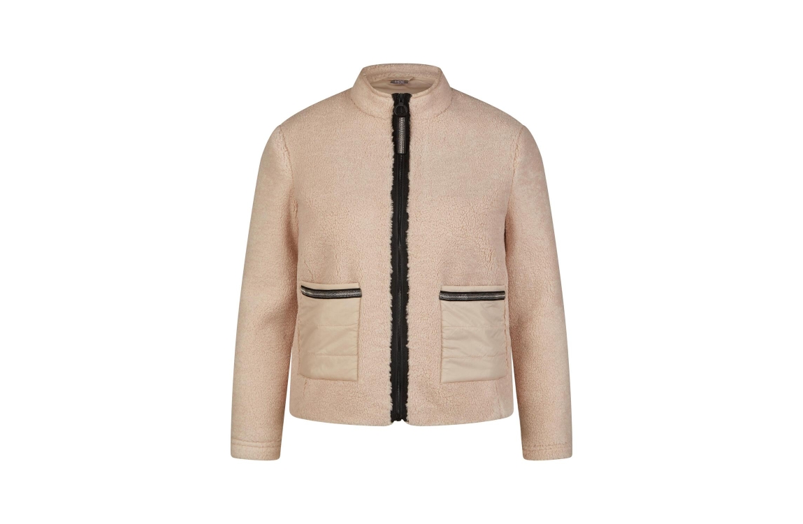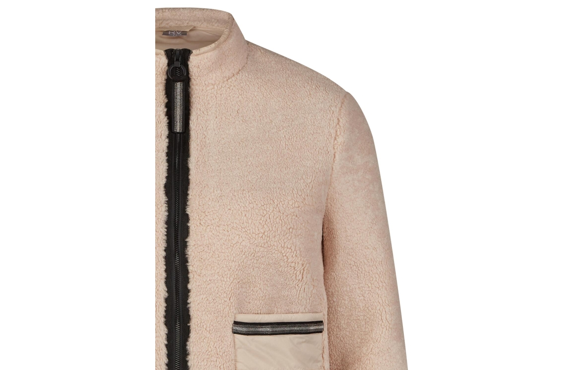 Rabe jack 53-221220. Dit rechtvallende model is voorzien van een opstaande kraag en heeft lange mouwen. Deze beige jas van Rabe sluit door middel van een rits en is uitgevoerd in een teddy kwaliteit. Dit model is voorzien van twee steekzakken afgewerkt met een metallic bies.