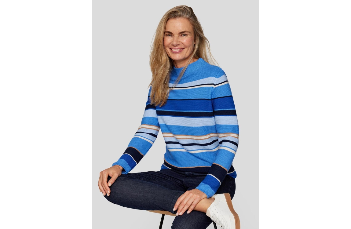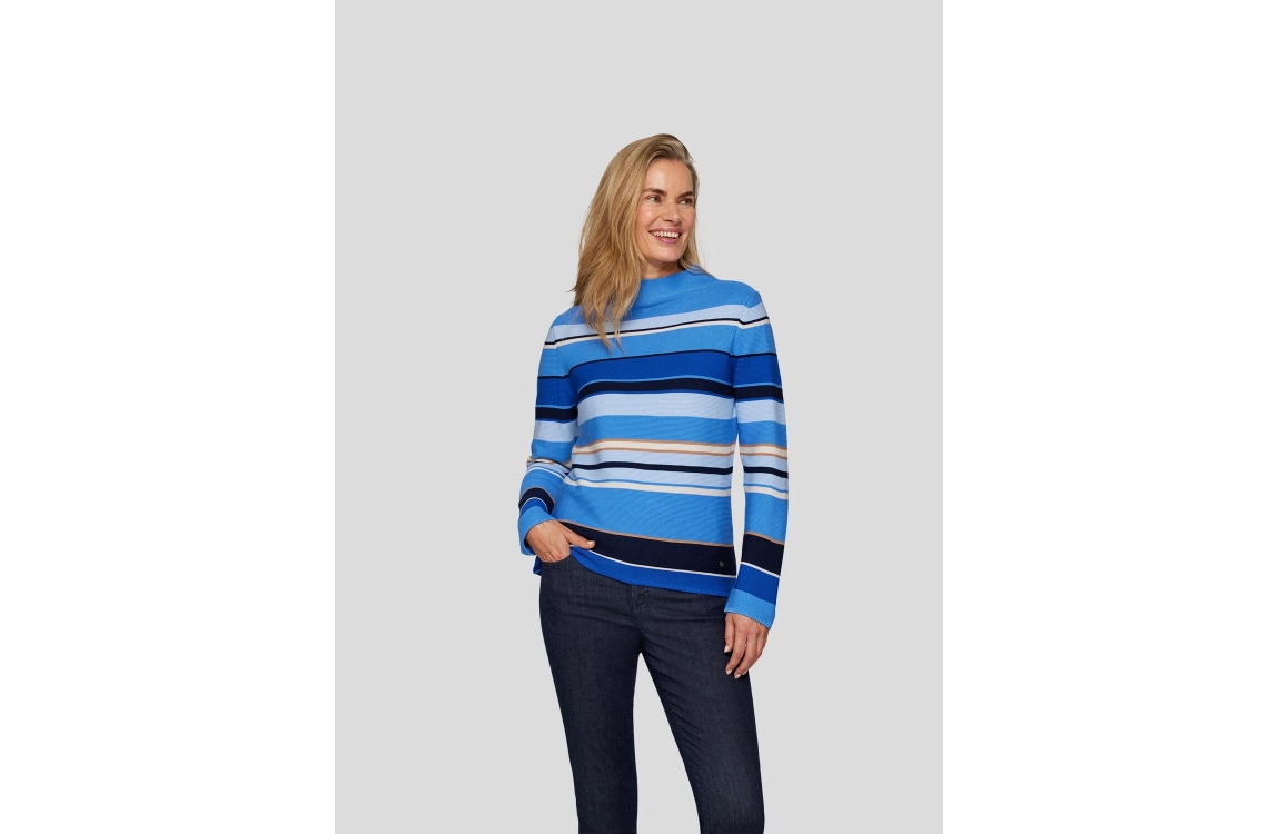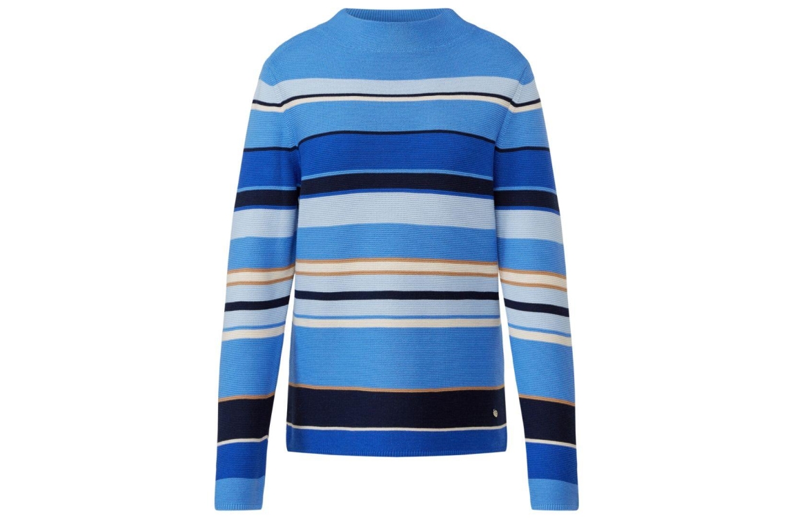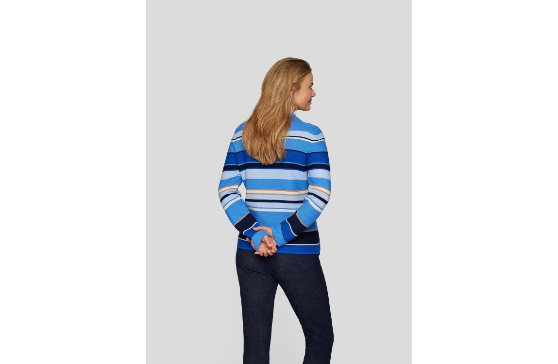 Rabe top 53-123602. Dit rechtvallende model is voorzien van een turtle neck en heeft lange mouwen. Deze blauwe top van Rabe is bewerkt met horizontale strepen en is uitgevoerd in een fijn gebreide kwaliteit.