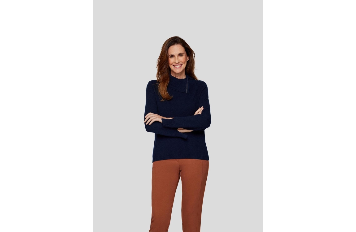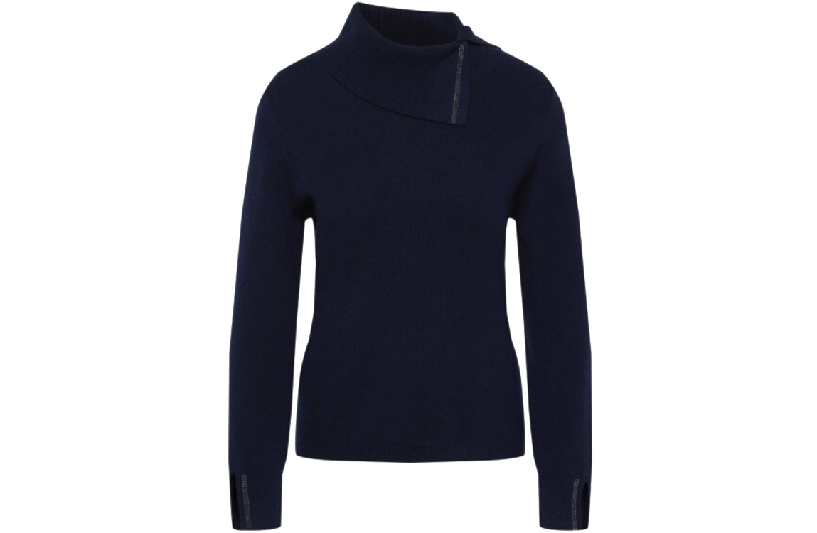 Rabe Online trui 53-132604. Dit rechtvallend model heeft een omgeslagen col met strass steentjes en lange mouwen. Deze blauwe trui van Rabe is voorzien van strass steentjes op de mouwen en een klein splitje bij de mouw.