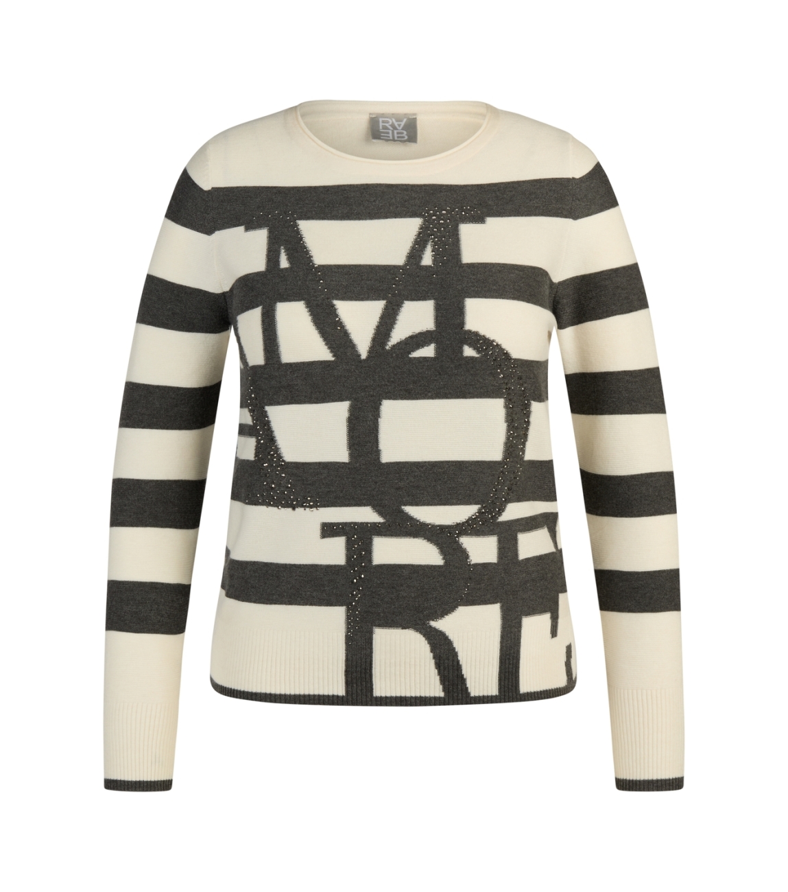 Rabe pullover 55-122603. Dit rechtvallend model is voorzien van een ronde hals en heeft lange mouwen. Deze wit/grijs gestreepte pullover van Rabe is bewerkt met strass steentjes aan de voorzijde.