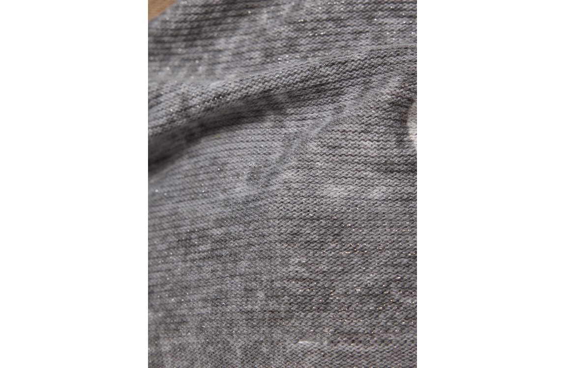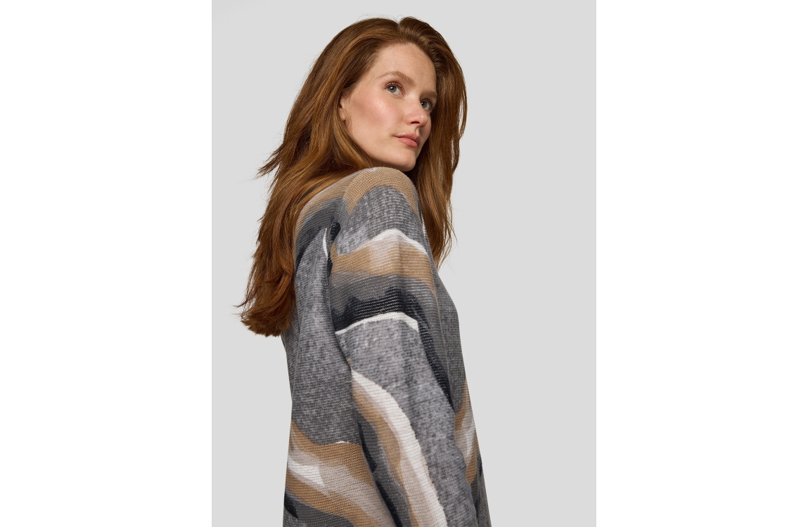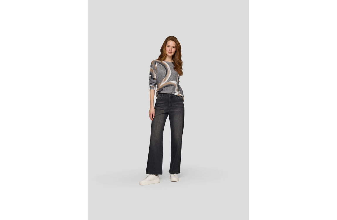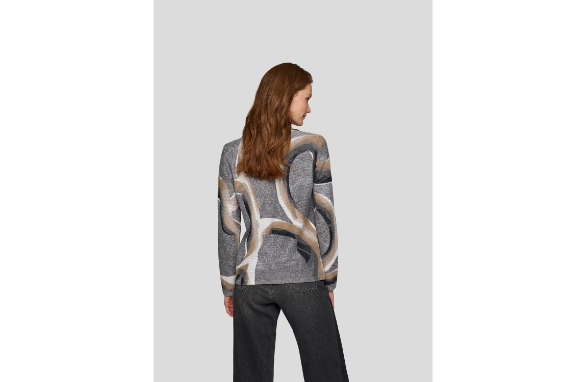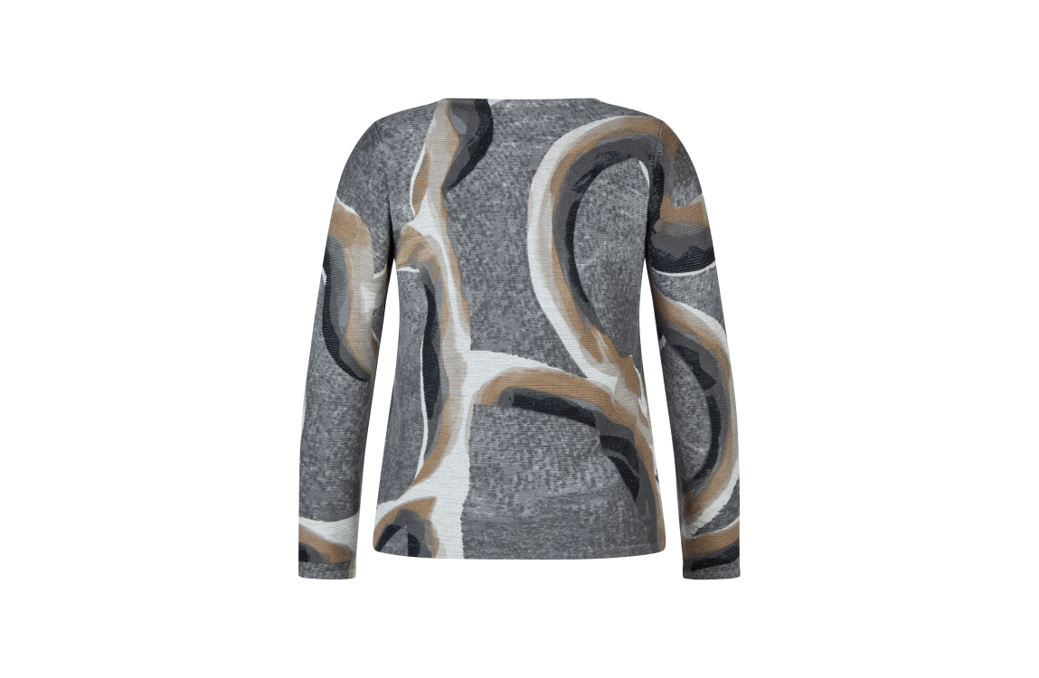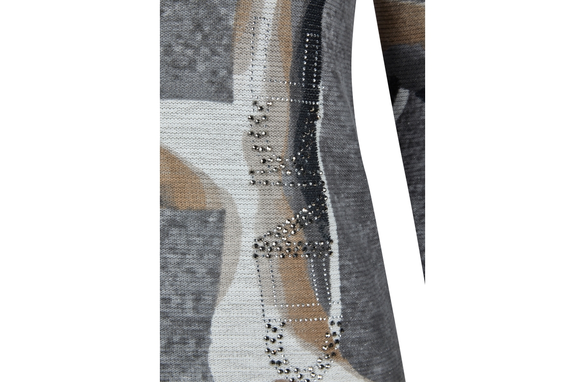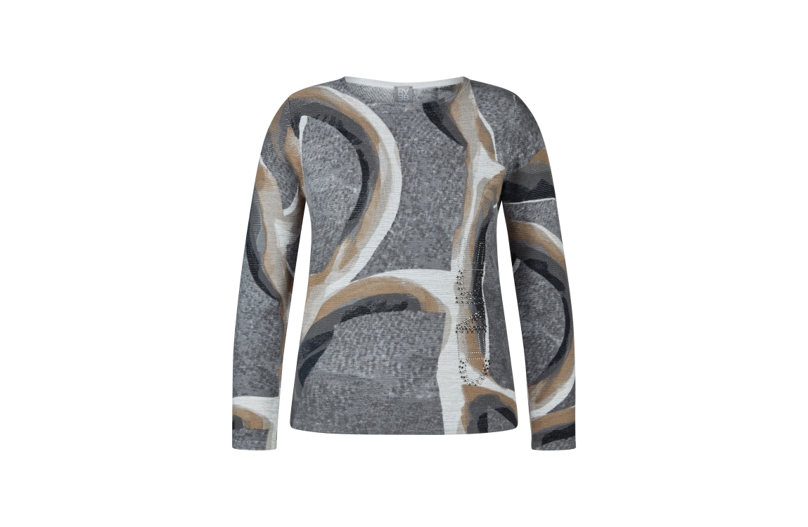 Rabe pullover 55-121628. Dit rechtvallende model heeft een ronde hals en lange mouwen. Deze grijze pullover van Rabe is bewerkt met een grafische print en strass-steentjes.