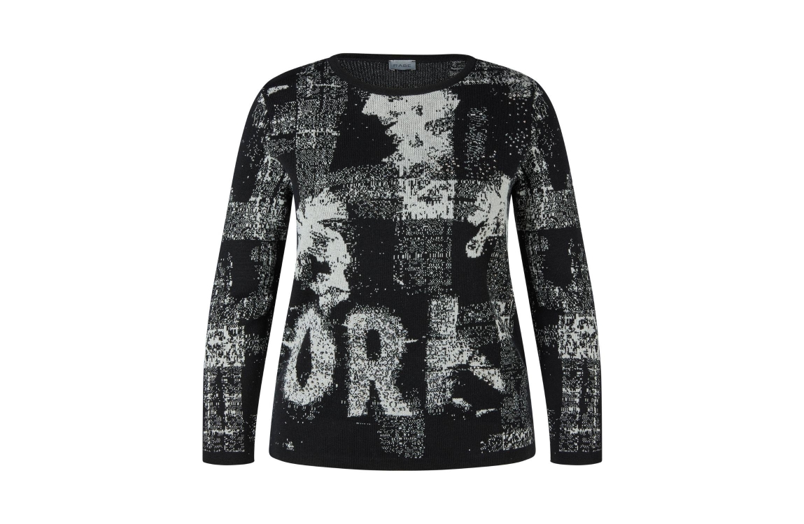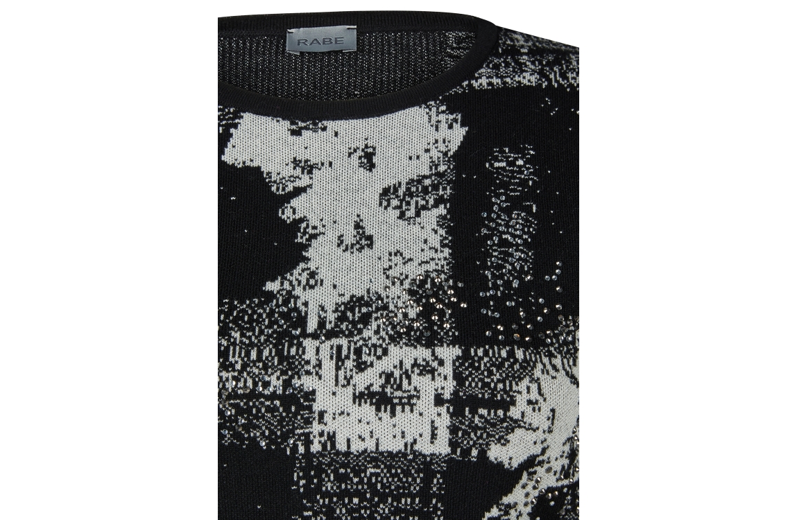 Rabe Pullover 5099 Schwarz. Dit rechtvallende model heeft een ronde hals en lange mouwen. Deze zwarte trui van Rabe is bewerkt met een all-over grafische opdruk en strass-steentjes aan de voorzijde.