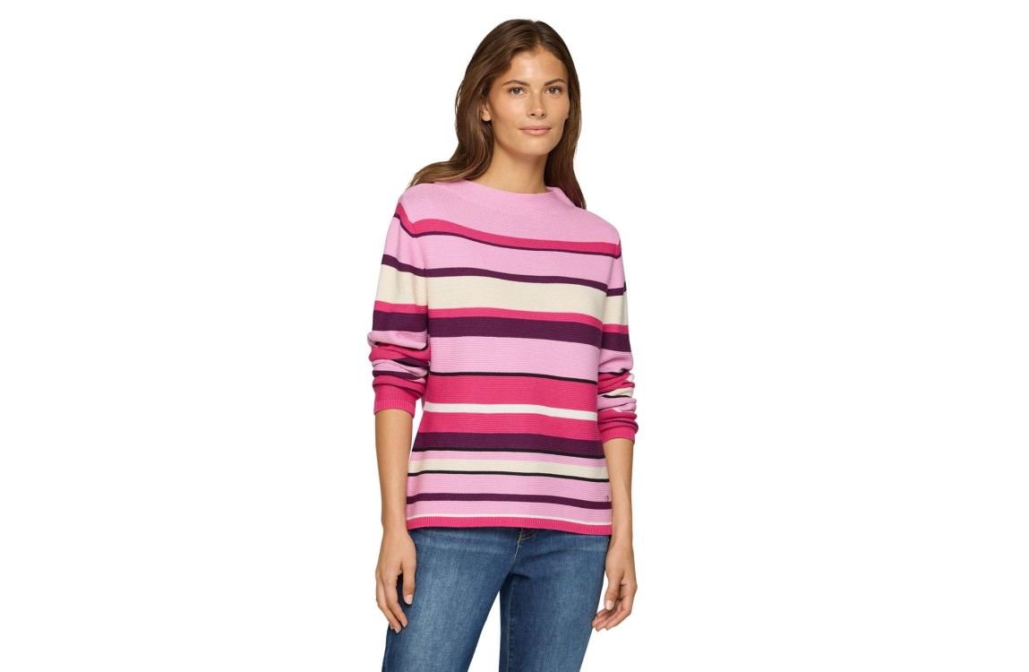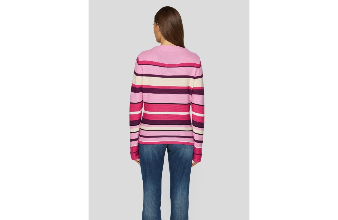 Rabe pullover 55-121633 5254. Dit rechtvallende model heeft een trechterhals en lange mouwen. Deze multi-colour pullover van Rabe is all-over bewerkt met een streepprint en is uitgevoerd in een fijn breisel.