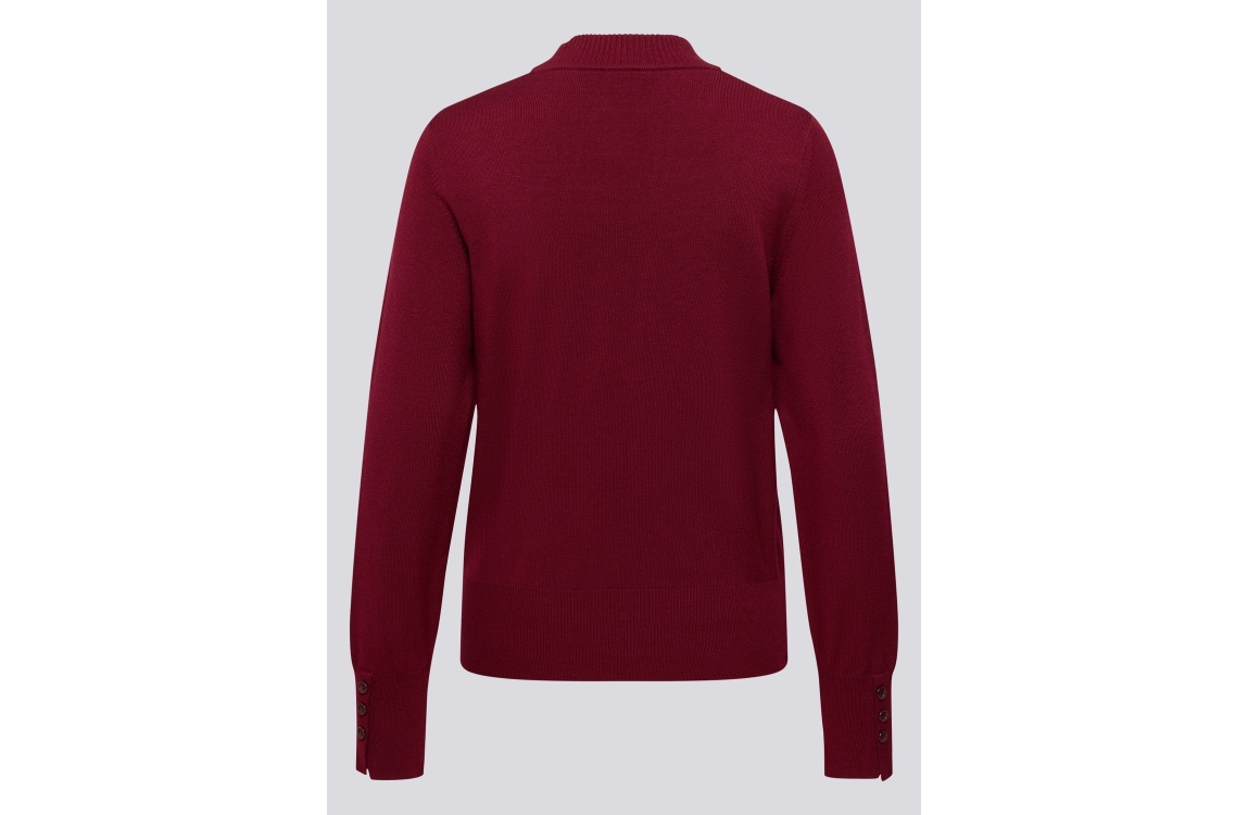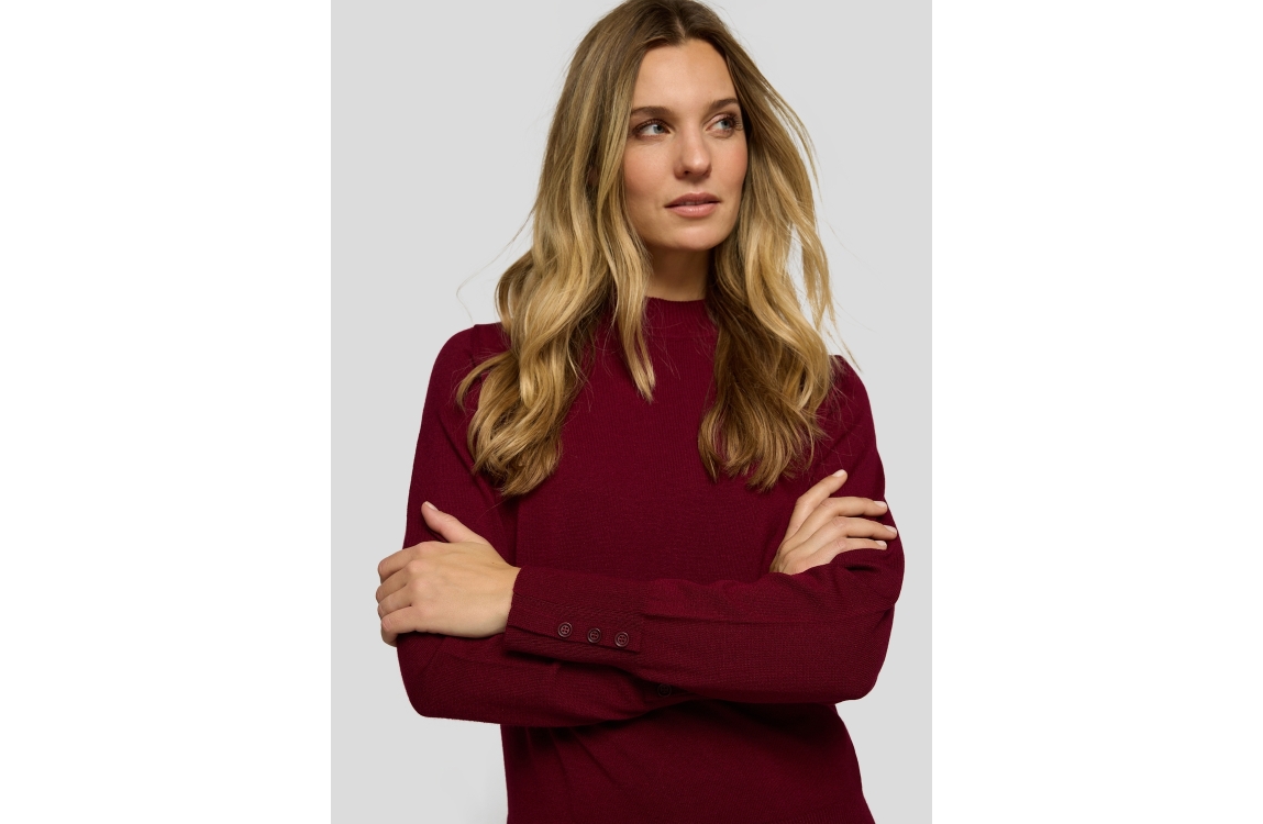 Rabe pullover 55-124600. Dit rechtvallendE model is voorzien van een turtleneck en heeft lange mouwen, bewerkt met decoratieve knopen. Deze burgundy pullover van Rabe is afgewerkt met ribgebreide boorden.