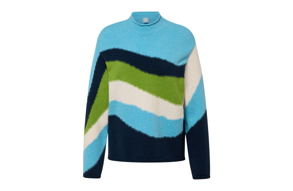 Rabe pullover 55-223609 5321. Dit rechtvallende model heeft een ribgebreide turtleneck en lange mouwen. Deze lichtblauwe pullover van Rabe is all-over bewerkt met een streepprint in verschillende kleuren en heeft afgewerkte boorden.