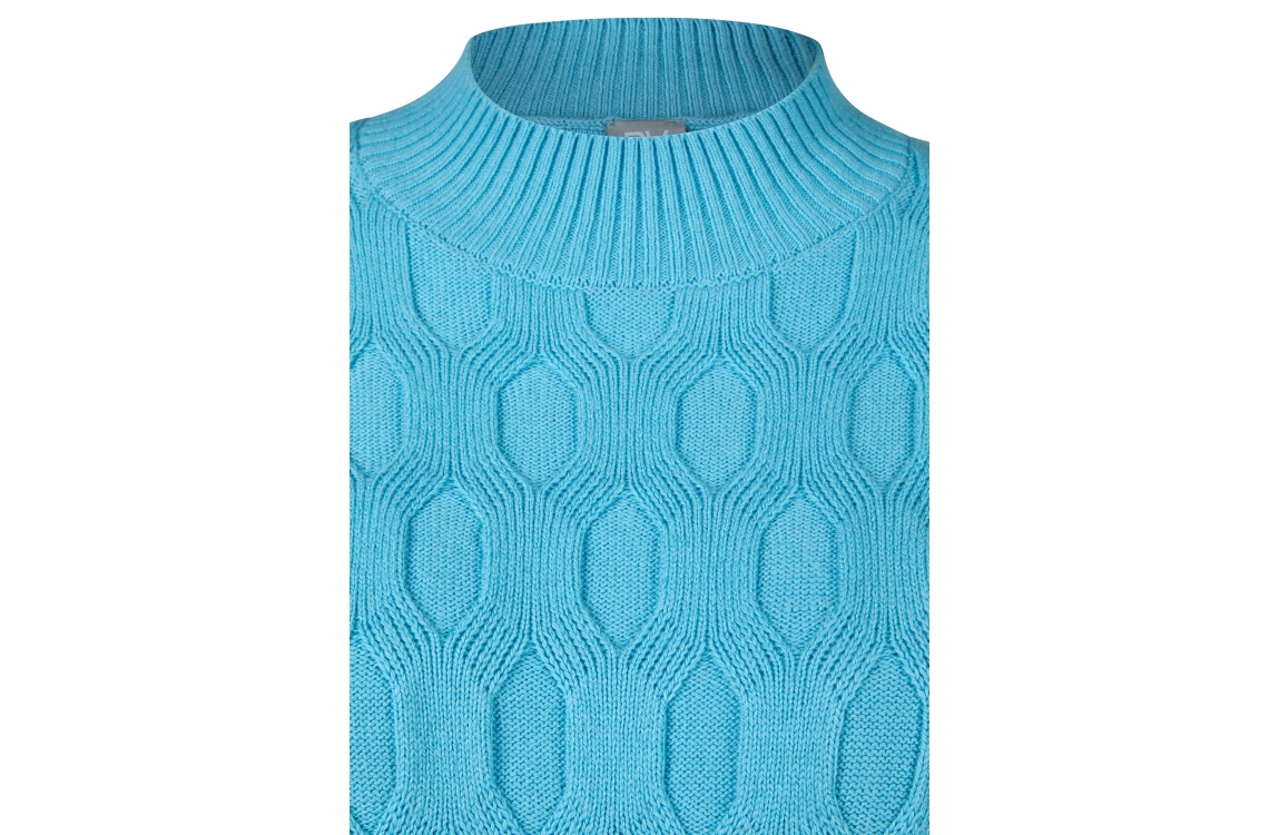 Rabe pullover 55-223605 5326. Dit rechtvallende model heeft een turtleneck en lange mouwen. Deze lichtblauwe pullover van Rabe is bewerkt met het klassieke kabelpatroon (in ronde vorm) en is afgewerkt met ribgebreide boorden.