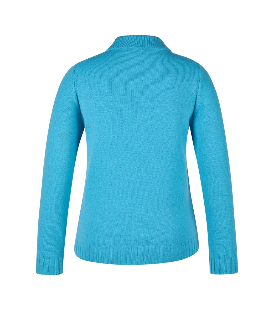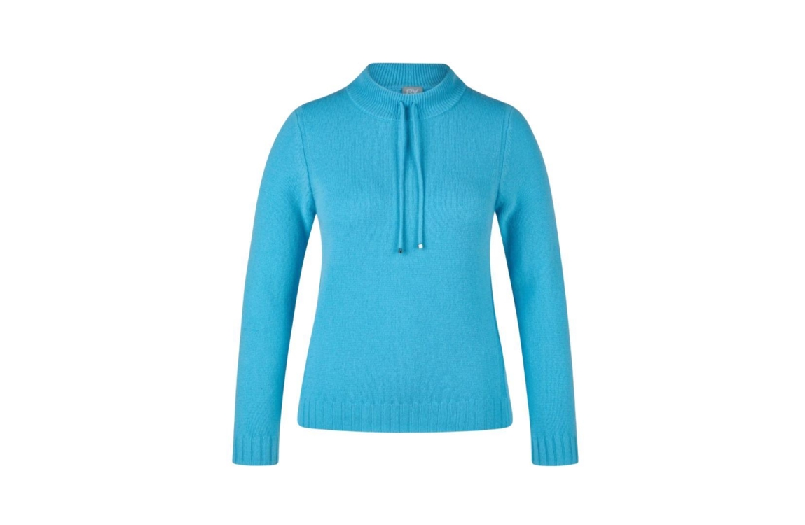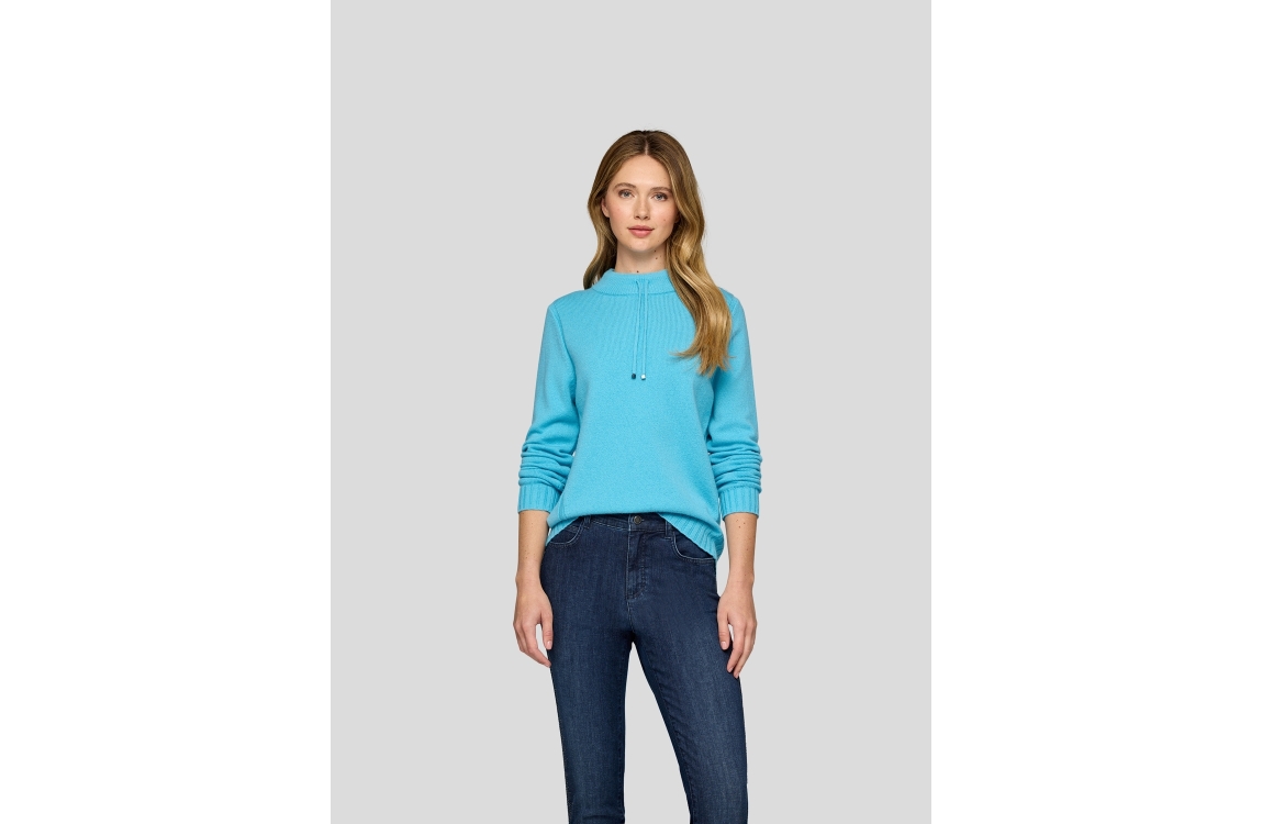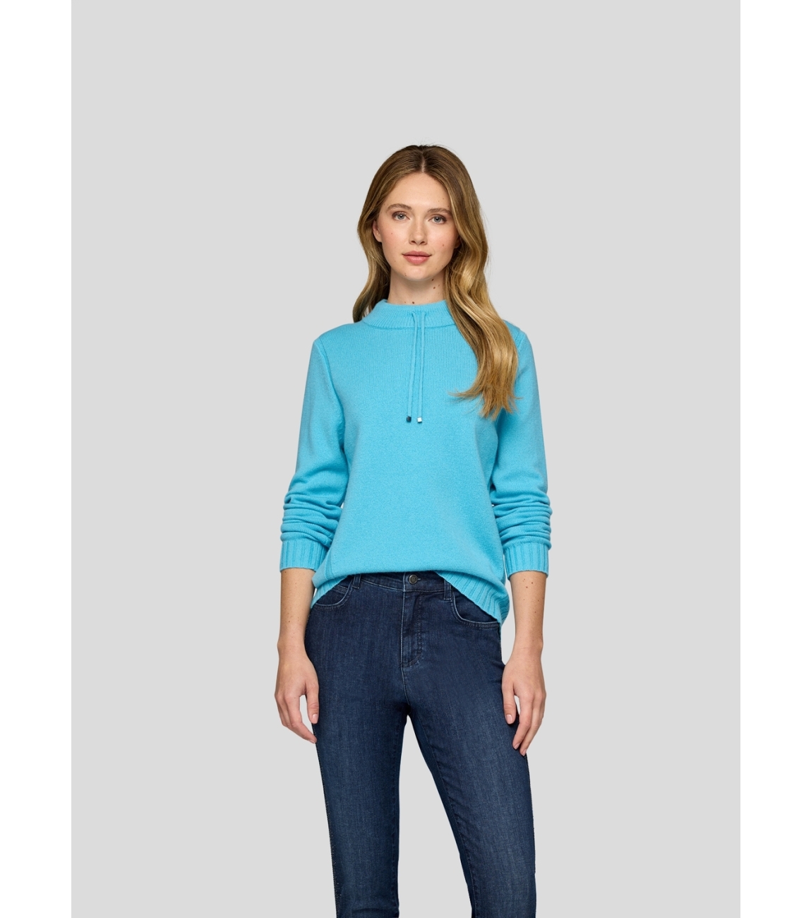 Rabe pullover 55-223600. Dit rechtvallend model is voorzien van een hoge ronde hals en heeft lange mouwen. Deze blauwe pullover van Rabe is afgewerkt met trekkoorden bij de hals.