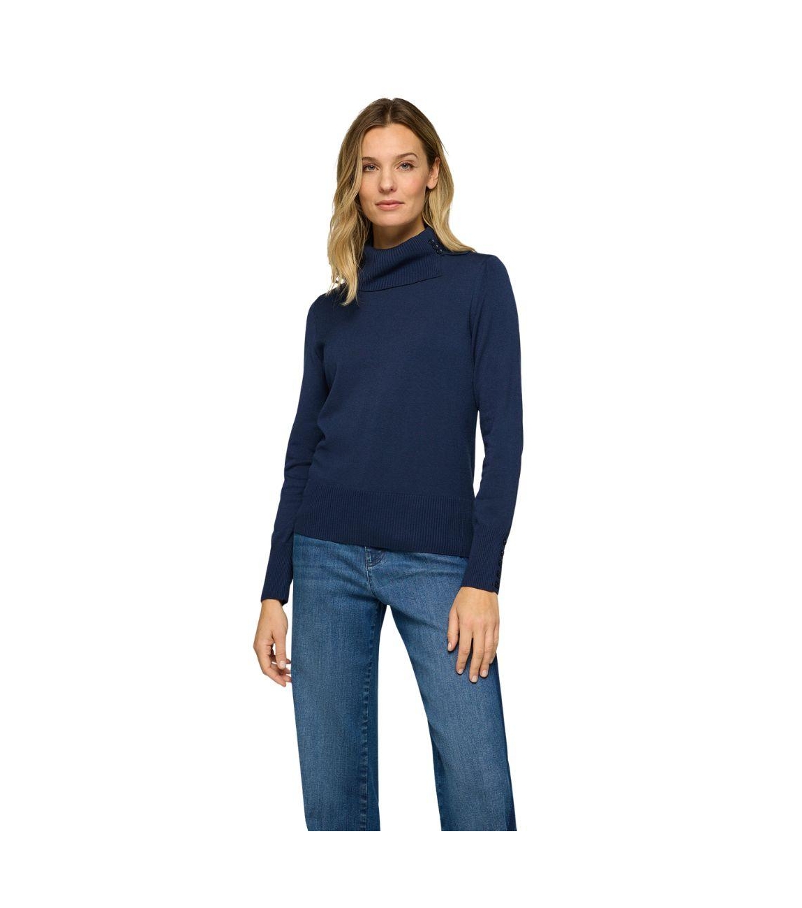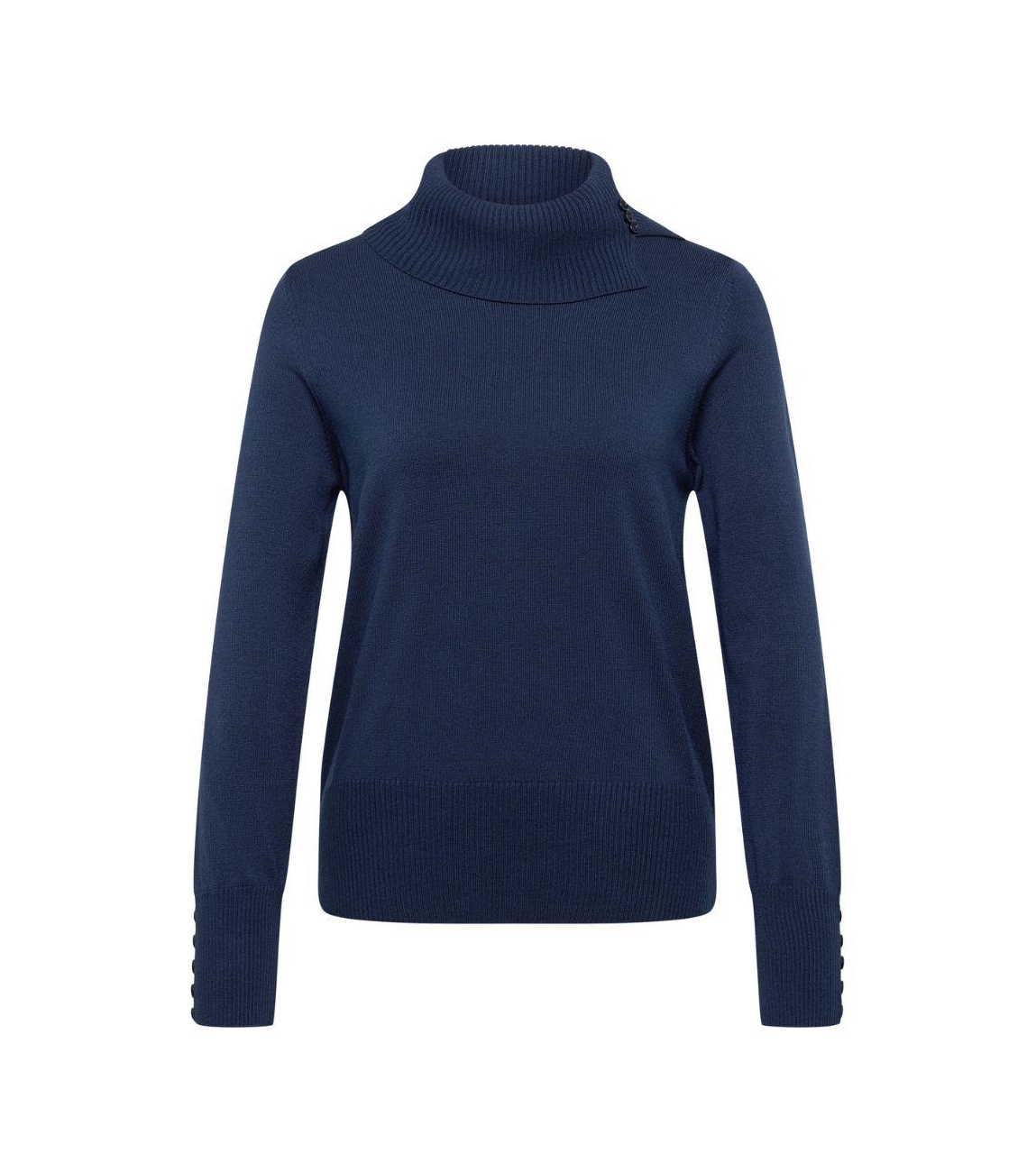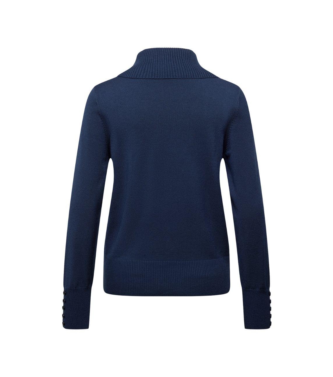 Rabe pullover 55-123618. Dit rechtvallend model is voorzien van een col en heeft lange mouwen beide bewerkt met decoratieve knopen. Deze donkerblauwe pullover van Rabe is afgewerkt met ribboorden.