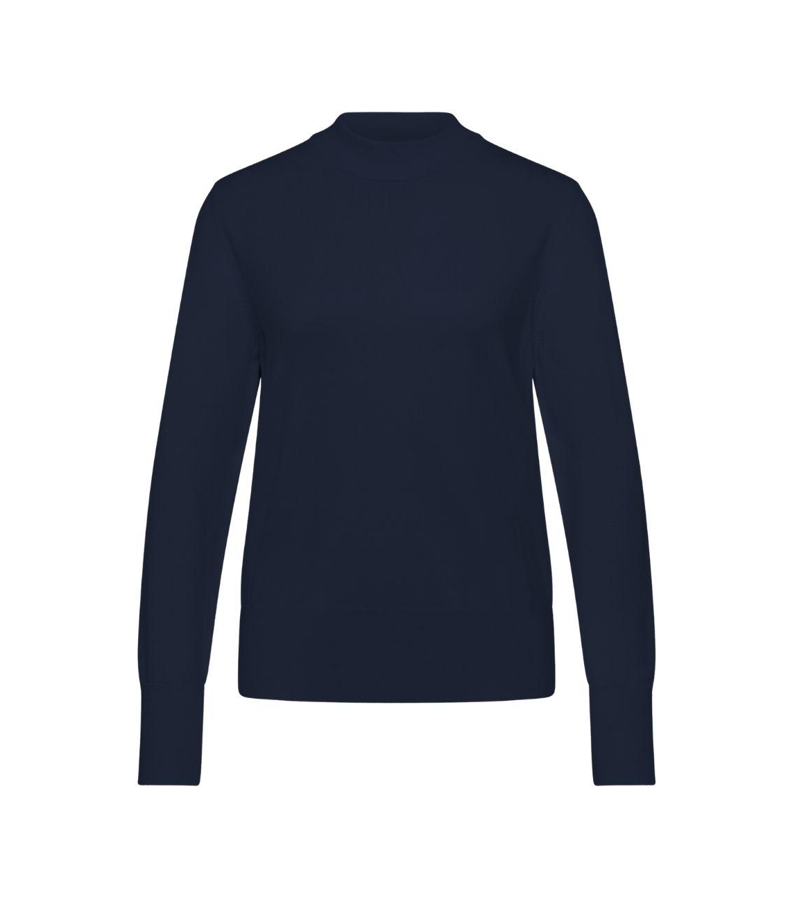 Rabe pullover 55-124600. Dit rechtvallend model is voorzien van een turtle neck en heeft lange mouwen bewerkt met decoratieve knopen. Deze donkerblauwe pullover van Rabe is afgewerkt met ribboorden.