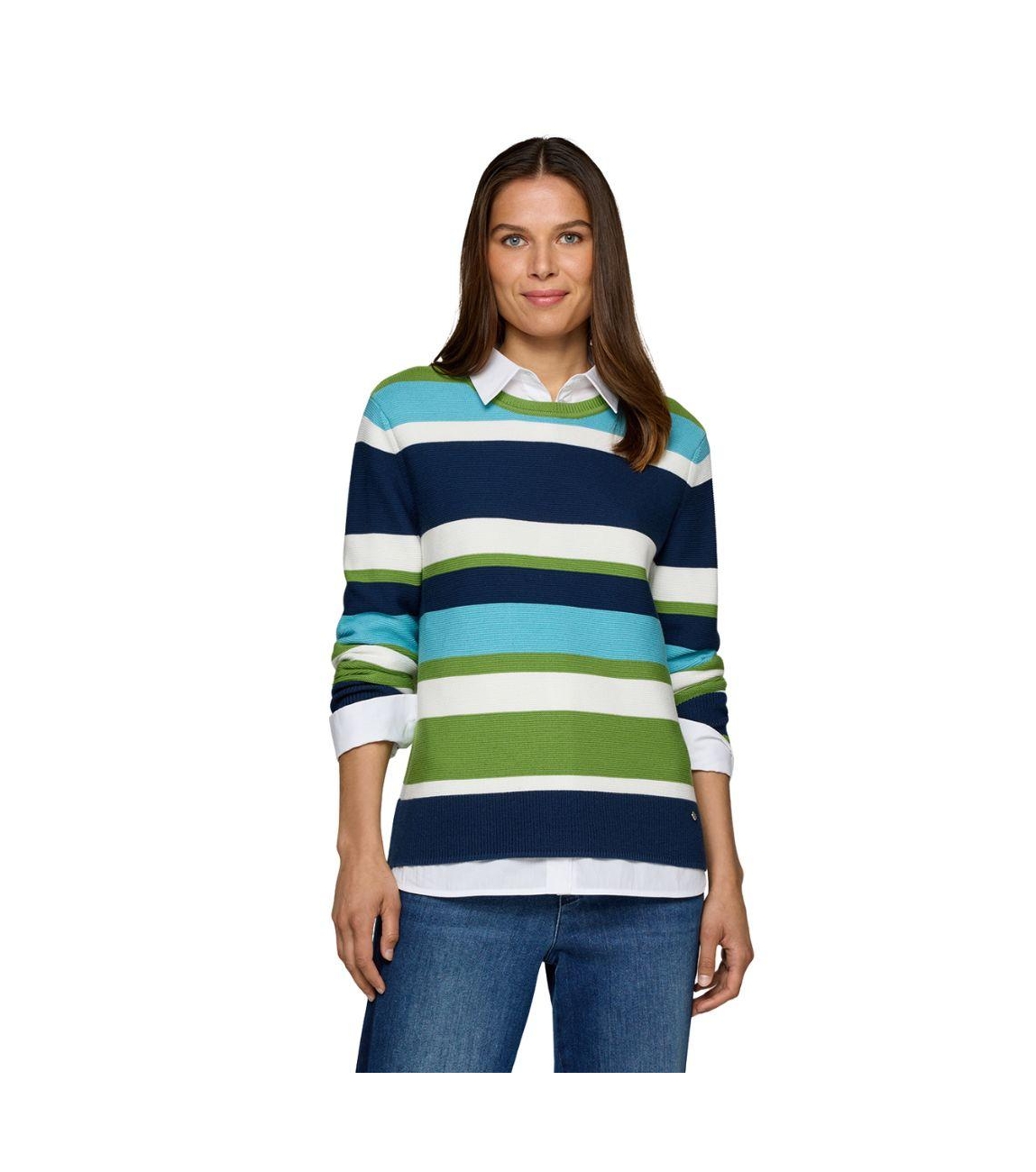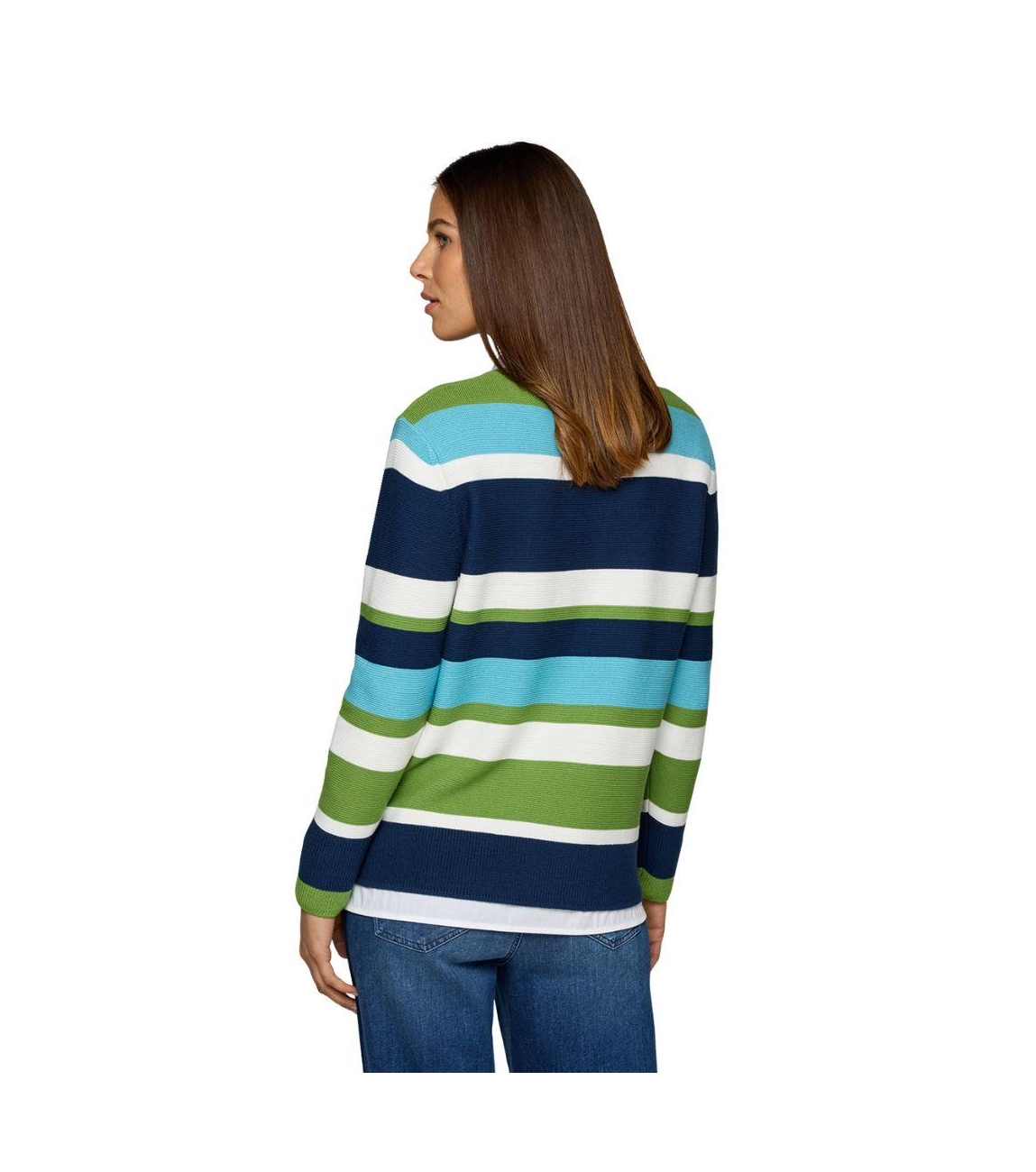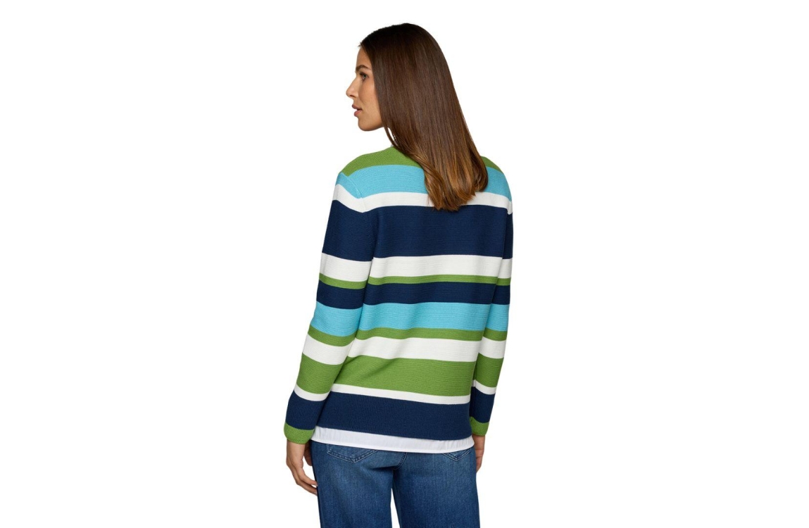 Rabe pullover 55-123615 5374. Dit rechtvallende model heeft een ronde halslijn en lange mouwen. Deze groene pullover van Rabe is all-over bewerkt met een streepprint in diverse kleuren en is uitgevoerd in een fijn breisel.