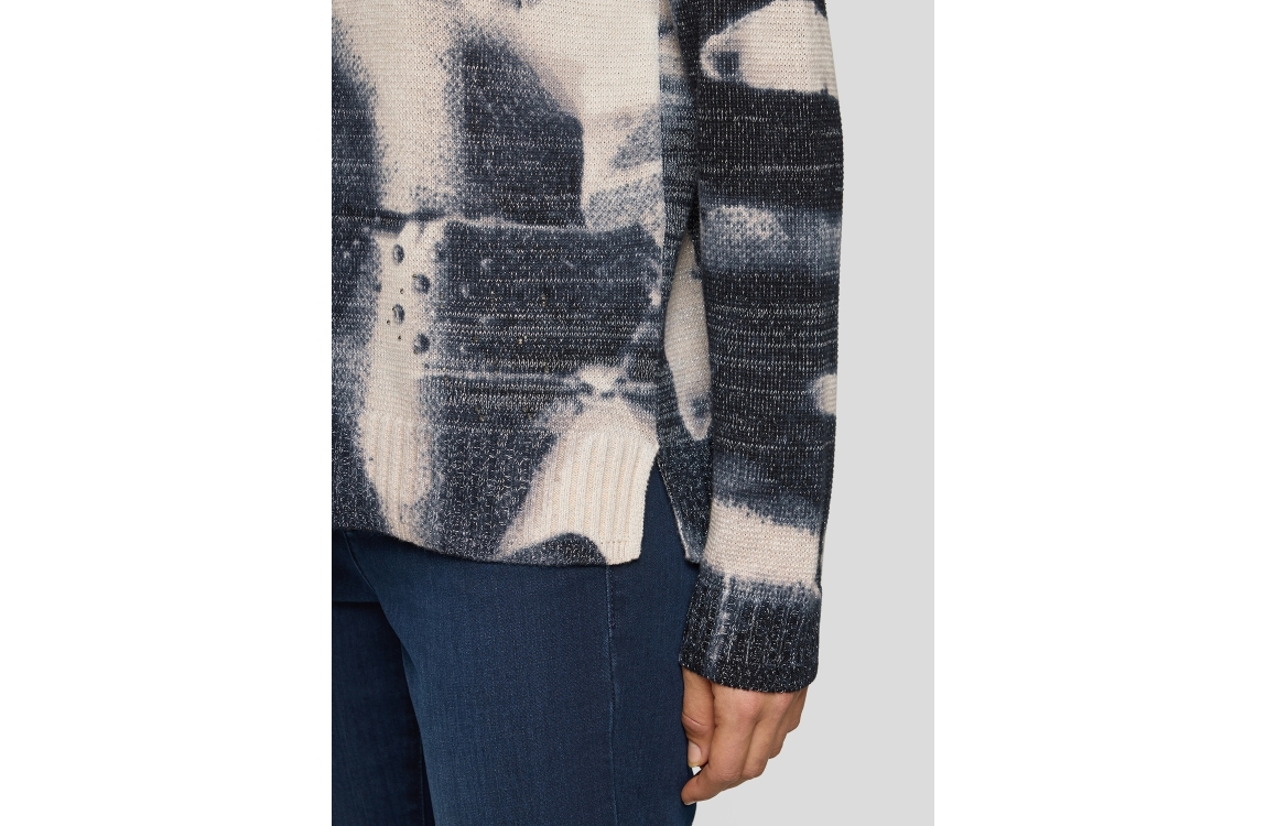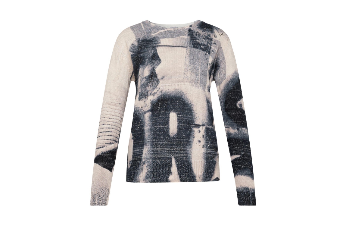 Rabe Pullover 5608 Elfenbein. Dit rechtvallende model heeft een ronde hals en lange mouwen. Deze grijze pullover van Rabe is afgewerkt met een zilvere opdruk en heeft strass-steentjes.