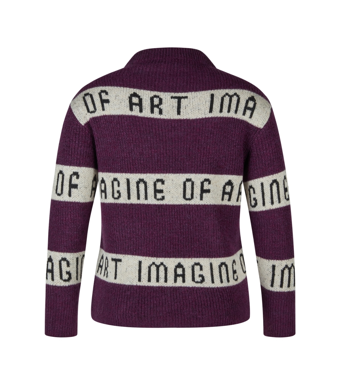 Rabe Pullover 5611 Vanille. Dit rechtvallende model heeft een ronde hals en lange mouwen. Deze paars gestreepte pullover van Rabe is gemaakt van een zacht materiaal. Dit model is all-over bewerkt met teksten en strass-steentjes.