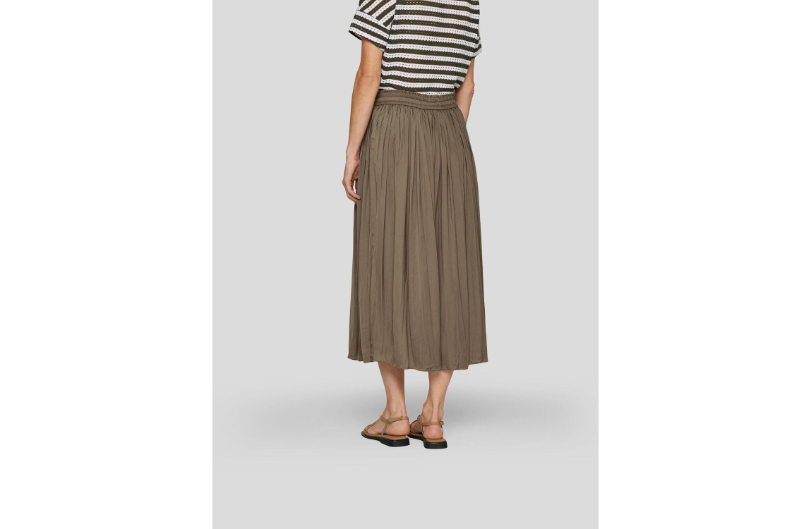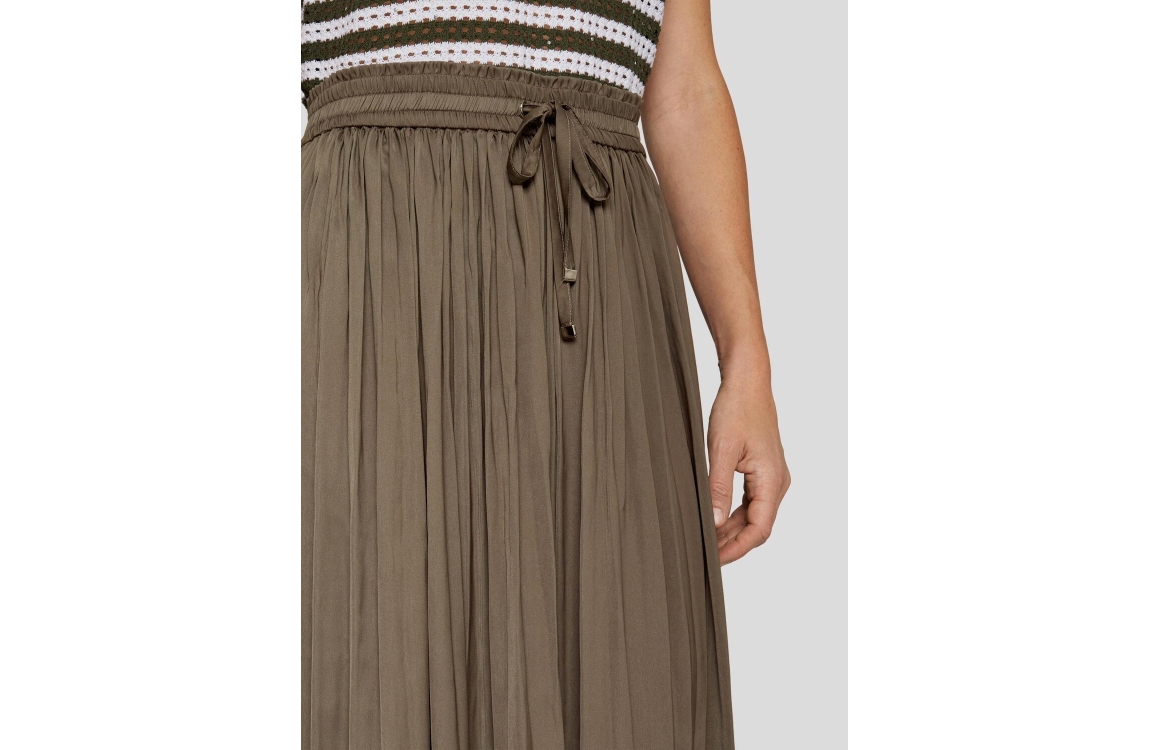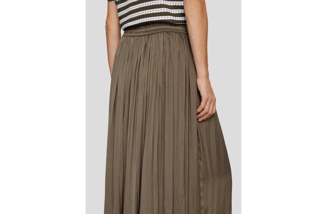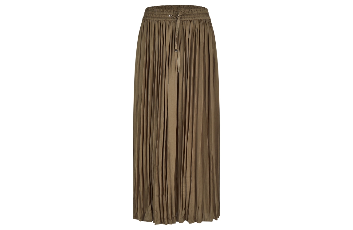 Rabe rok 54-221141. Dit rechtvallend model sluit door middel van een elastische boord met trekkoorden. Deze groene rok van Rabe is bewerkt met plissé.