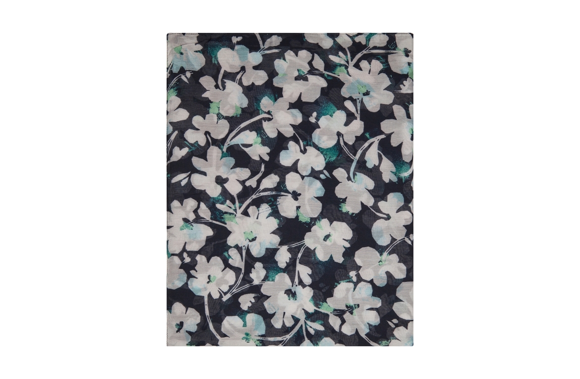 Rabe sjaal 52-214941. Dit rechthoekig model is uitgevoerd met een bloemen dessin. Deze blauwe sjaal van Rabe is uitgevoerd in semi-transparant materiaal.