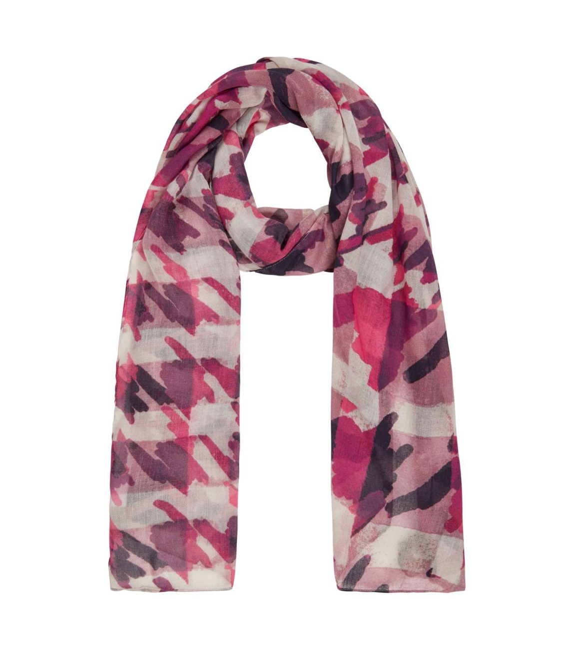 Rabe Schal 5287 Pflaume. Dit rechthoekig model is bewerkt met paarse bladprint.
