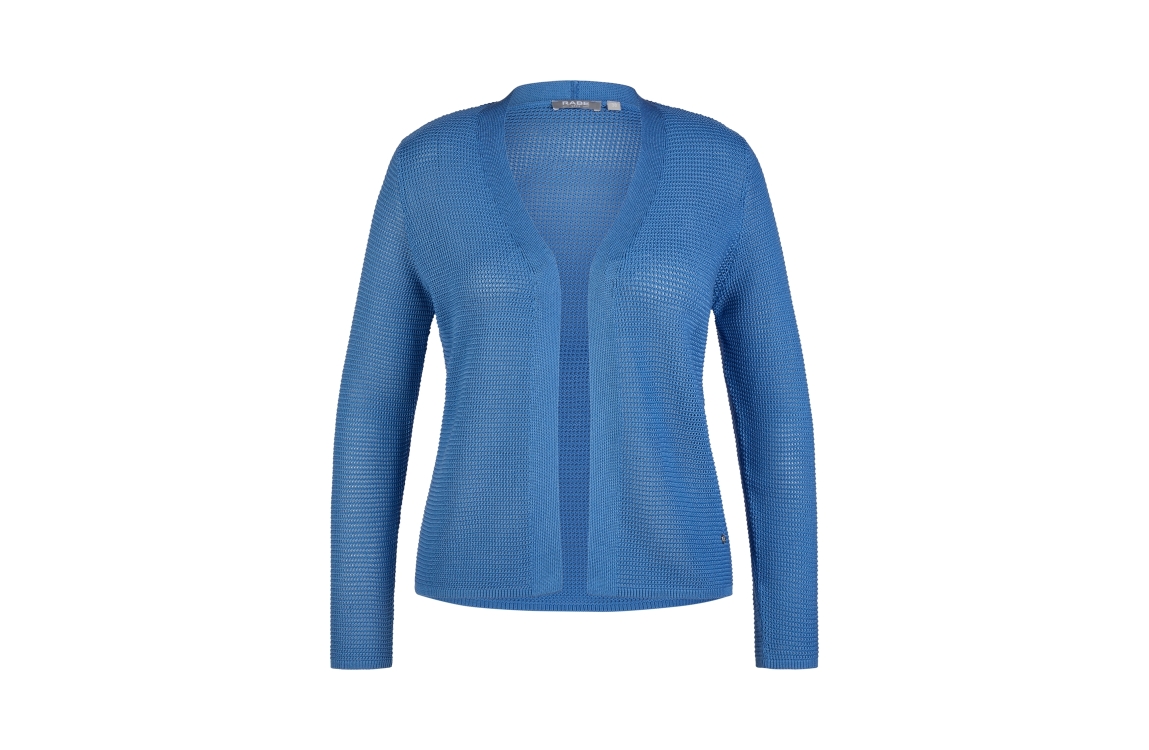 Rabe vest 52-121522. Dit openvallend model is voorzien van een ronde hals en heeft lange mouwen. Deze blauwe vest van Rabe is gehaakt uitgevoerd.