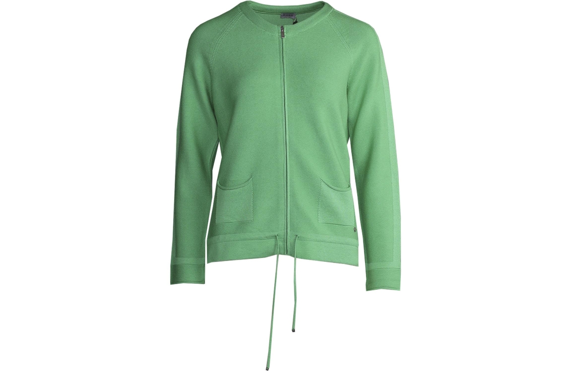 Rabe Online vest 52-113526. Dit rechtvallend model heeft een ronde hals en lange mouwen. Deze groene vest van Rabe sluit aan de voorzijde door middel van een rits en beschikt over een elastische aantrekkoord aan de onderzijde. De vest is voorzien van twee opgestikte steekzakken aan de voorzijde en de vest is afgewerkt met boorden.