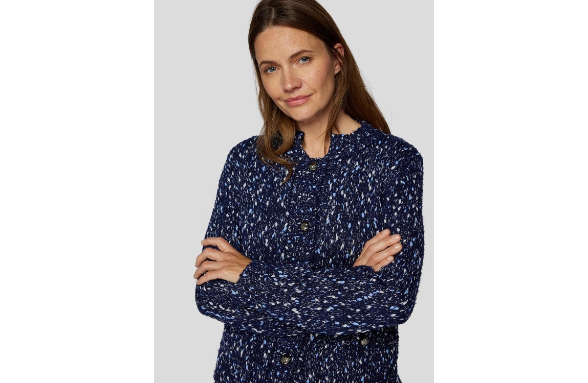 Rabe Online vest 53-224521. Dit rechtvallend model heeft een hoge ronde hals en lange mouwen. Deze donkerblauwe vest sluit aan de voorzijde door middel van zilverkleurige knopen en is all-over bewerkt met glitter breisels in verschillende kleuren.