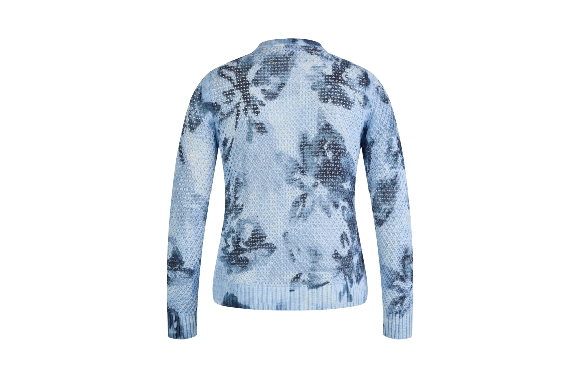 Rabe Online vest 54-213521. it rechtvallend model heeft een ronde hals en lange mouwen. Dit blauwe vest van Rabe sluit aan de voorzijde door middel van een rits en beschikt over een ribboord aan de onderzijde. Het opengewerkte vest is bewerkt met een all-over print.