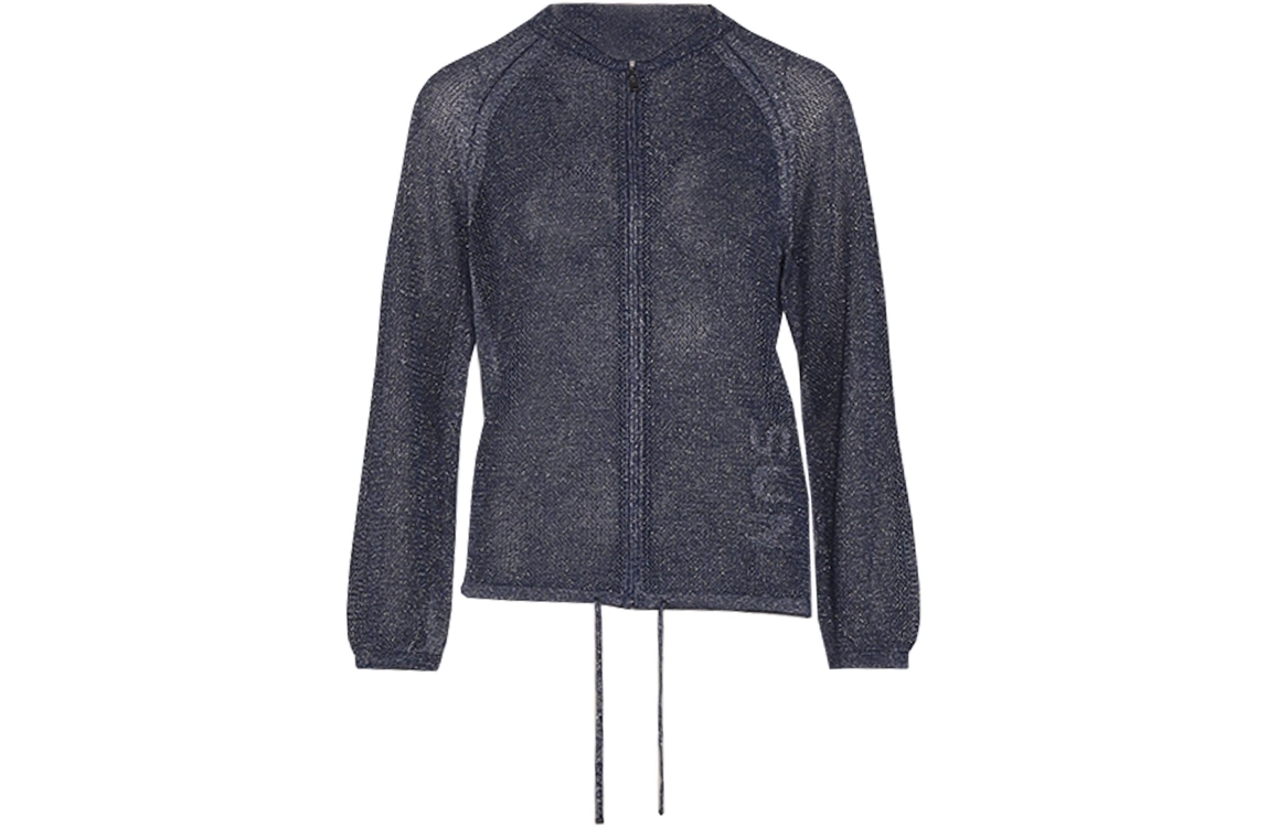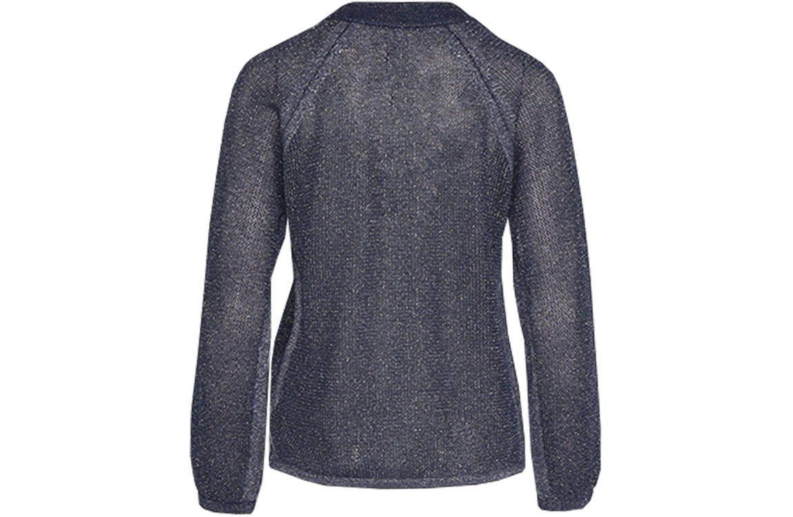 Rabe Online vest 54-221521 4377. Dit rechtvallend model heeft een ronde hals en lange mouwen met elastische boorden. Deze blauwe vest van Rabe sluit aan de voorzijde door middel van een rits en is beschikt over een trekkoord in de onderboord. Dit model is uitgevoerd in een open gehaakt model en is all-over bewerkt met glitterdraden.
