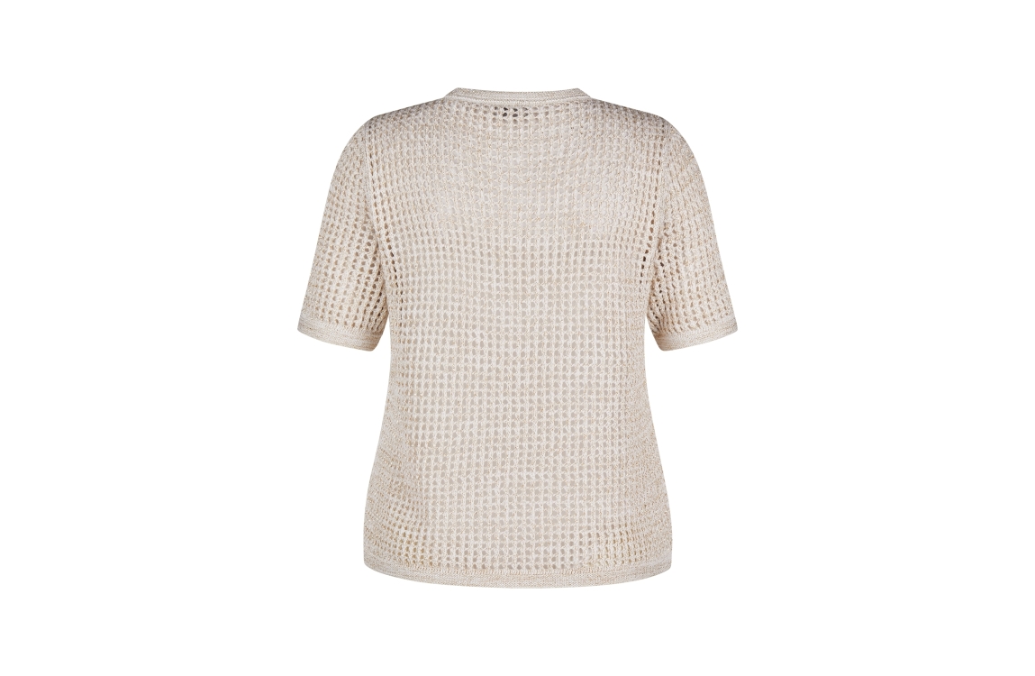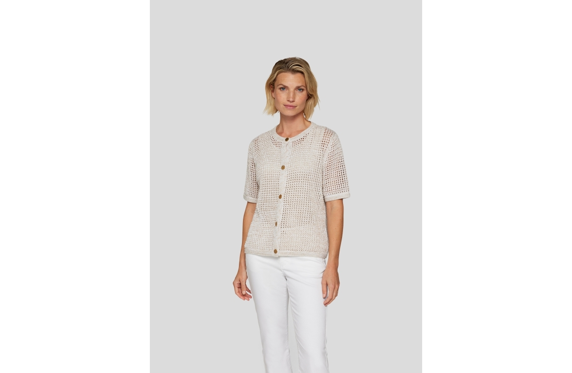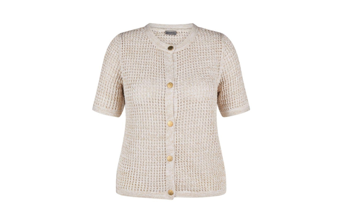 Rabe Online vest 54-124520. Dit rechtvallende model is voorzien van een ronde hals en korte mouwen. Dit beige vest van Rabe sluit aan de voorzijde door middel van knopen. Dit model is gehaakt en bewerkt met een glinstering.