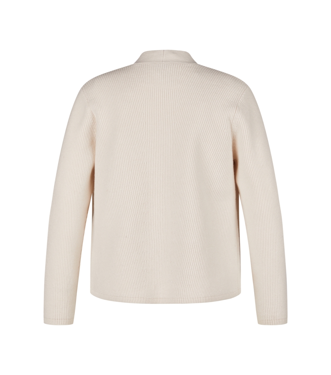 Rabe vest 55-124522 5611. Dit rechtvallende model heeft een halve ronde hals en lange mouwen. Deze vanillekleurige vest van Rabe is uitgevoerd in een ribgebreide kwaliteit en heeft een comfortabele pasvorm.