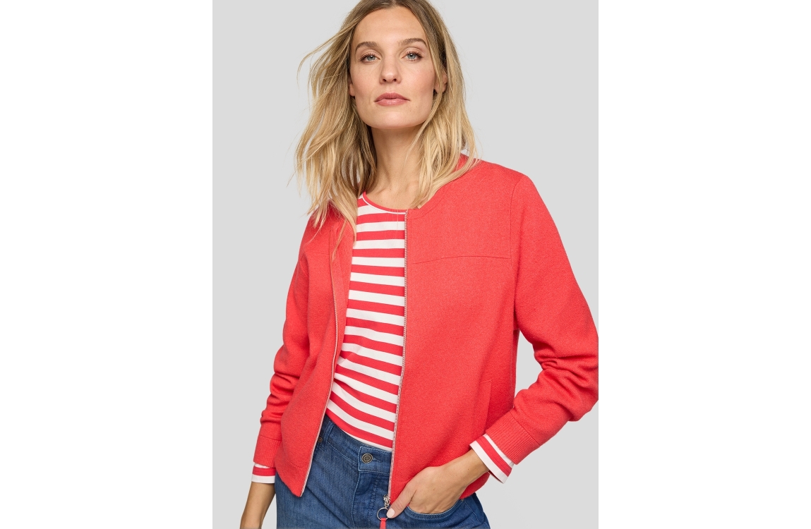 Rabe vest 56-111523 6280. Dit rechtvallende model heeft een ronde halslijn en lange mouwen. Deze roodkleurige vest van Rabe sluit aan de voorzijde door middel van een ritssluiting en is voorzien van twee steekzakken. Het model is afgewerkt met ribgebreide boorden.