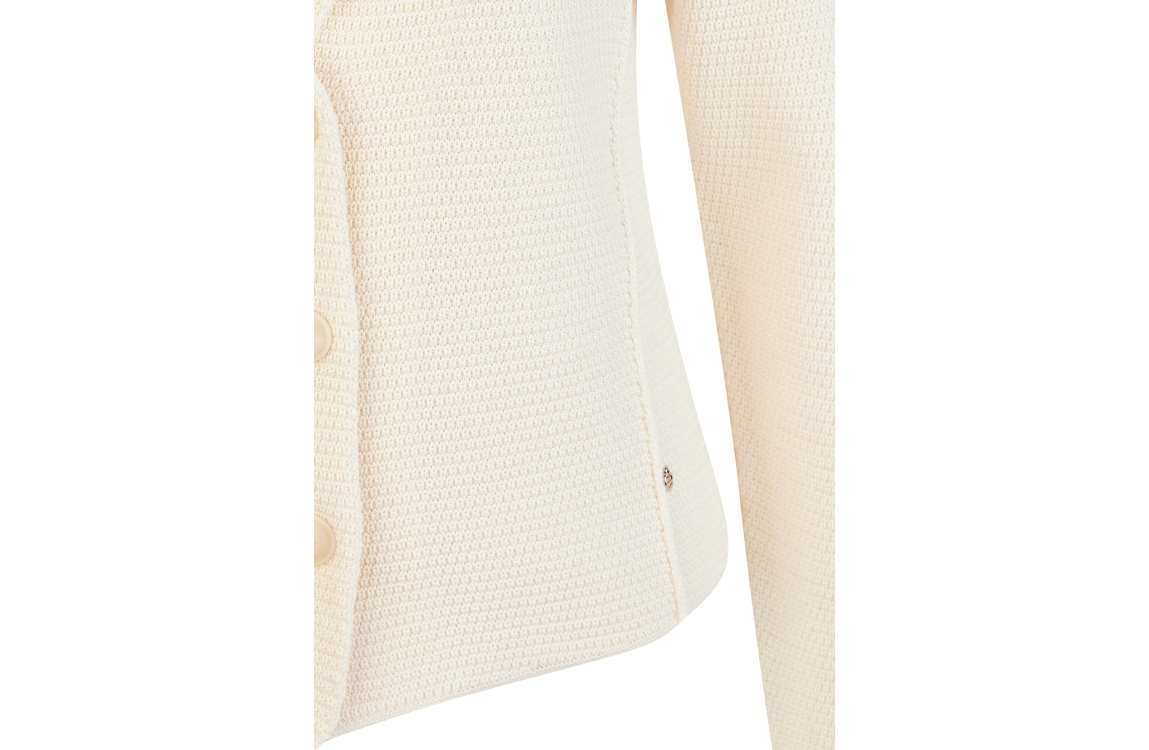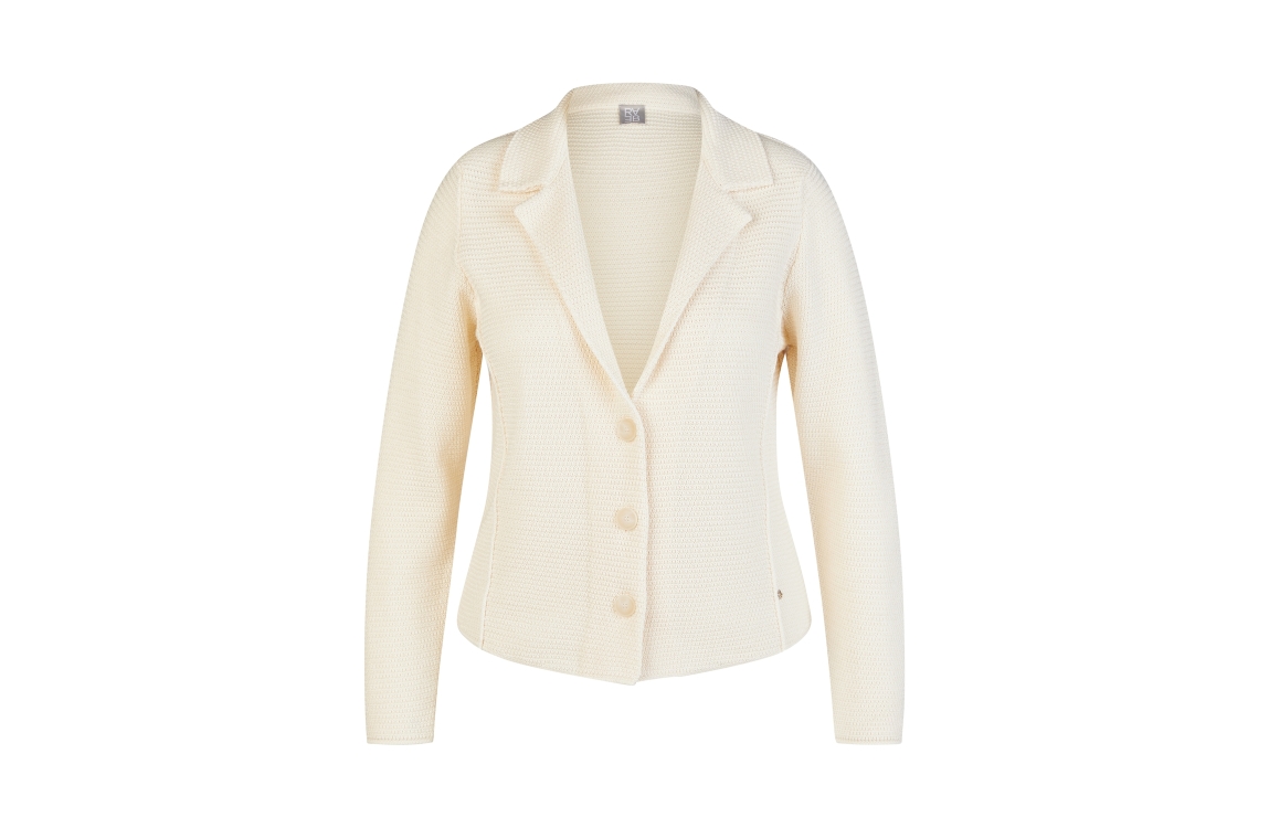 Rabe vest Alabaster 56-115554. Dit rechtvallend model is voorzien van een reverskraag en heeft lange mouwen afgewerkt met schoudervulling. Deze crèmekleurige vest van Rabe sluit door middel van knopen.