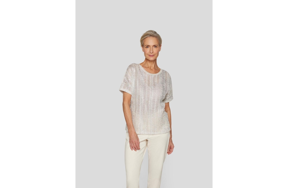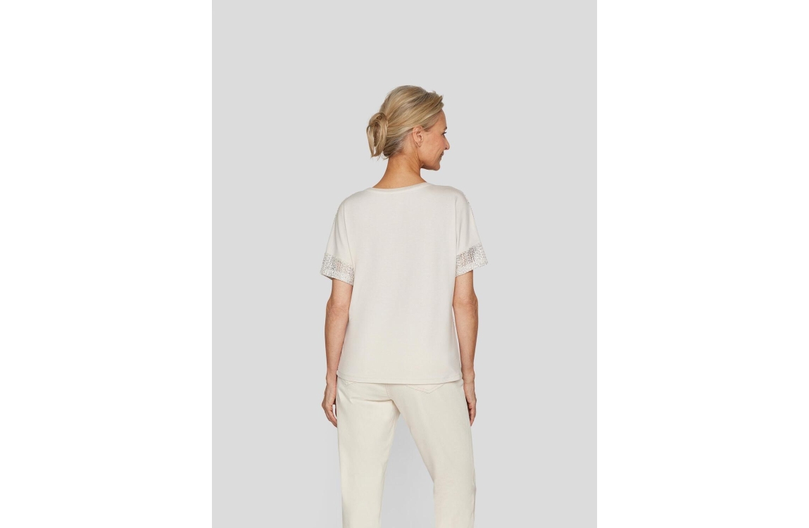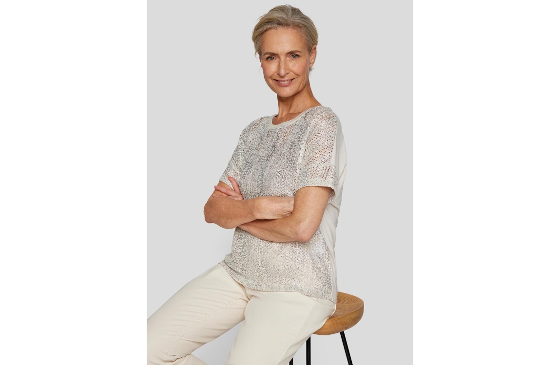 Rabe Online t-shirt 54-224304. Dit rechtvallende model heeft een ronde hals en korte mouwen. Dit beige t-shirt van Rabe heeft een doorzichtige voorzijde en is afgewerkt met een zilveren glitter.