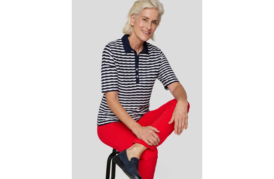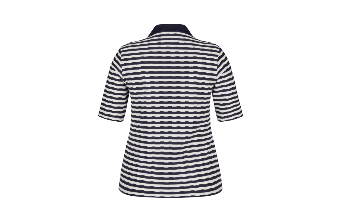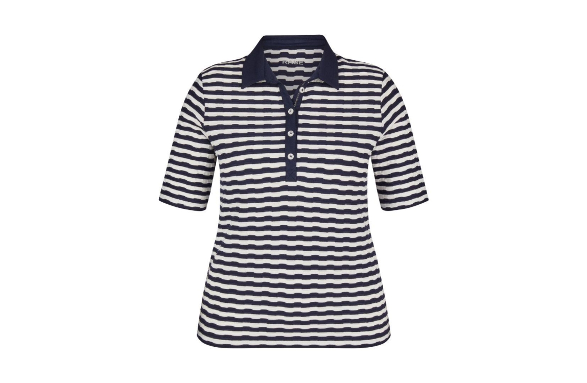 Rabe Online T-shirt 54-123355. Dit rechtvallende model is voorzien van een kraag en heeft korte mouwen. Dit donkerblauw gestreepte shirt van Rabe sluit aan de voorzijde door middel van knopen. Dit model is uitgevoerd in een elastische kwaliteit.
