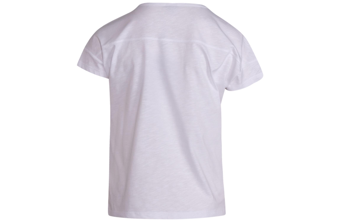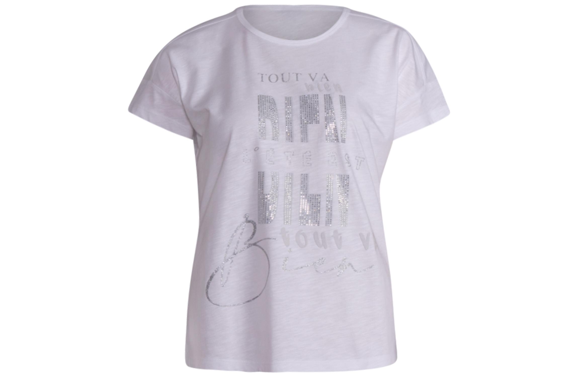Rabe Online T-shirt 54-224303. Dit rechtvallend model heeft een ronde hals met afhangende schouders en korte mouwen. Deze witte T-shirt van Rabe is op het voorpand bewerkt met een tekstopdruk en strass-steentjes.