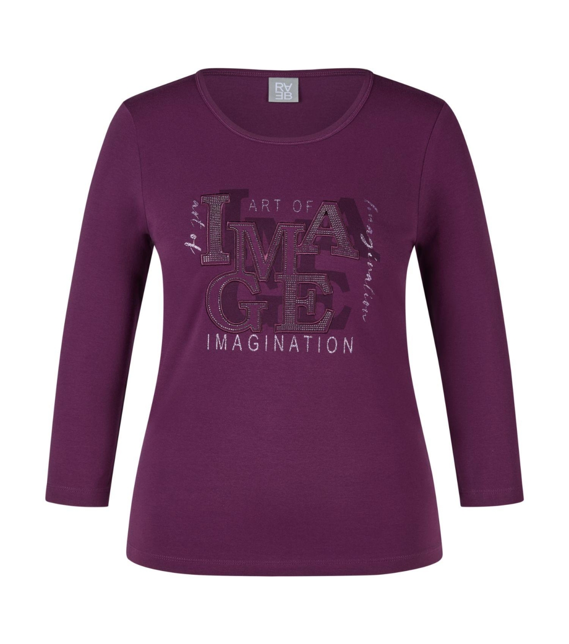 Rabe T-Shirt 5287 Pflaume. Dit rechtvallende model heeft een ronde halslijn en driekwart mouwen. Dit paarse shirt van Rabe is op het voorpand bewerkt met een tekstopdruk en strass-steentjes. Het model is uitgevoerd in stretchkwaliteit